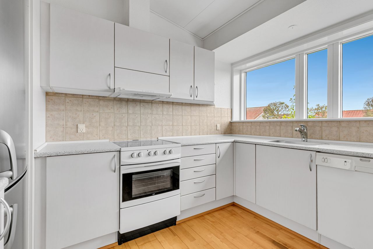 Fra stuen er der åben forbindelse til det pæne køkken med lyse elementer.