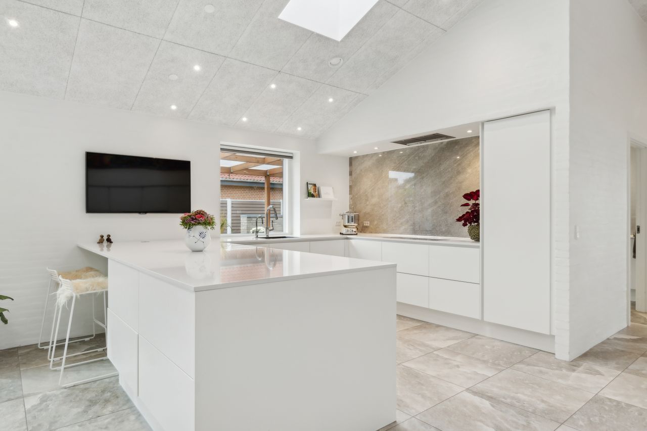 Velkommen til husets hjerterum, et unikt og stort køkken/alrum med højt til loftet, alkove og plads til stort spisebord. Boligens køkken/alrum har stort lyst svanekøkken med adgang til skjult viktualierum i køkkenets højvæg (der desuden også byder på 2 ovne, indbygget kaffemaskine og vinkøleskab). Fra køkken/alrum er der stort vinduesparti med skydedør ud til solrig fliseterrasse og ovenlysvinduer, som tilsammen giver et fantastisk lysindfald. I åben forbindelse fra køkken/alrum får du indretningsvenlig stue med adgang til børneafdeling og kontor.