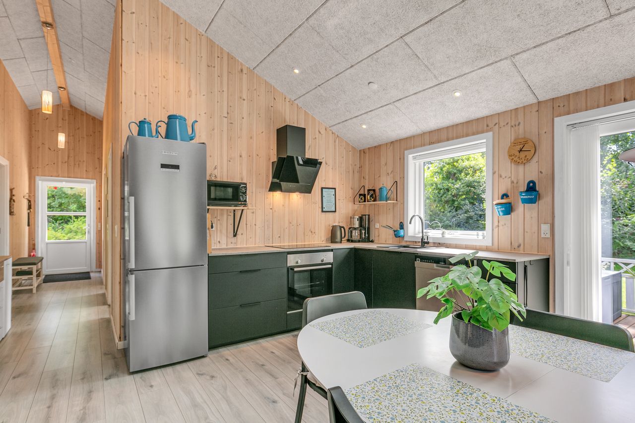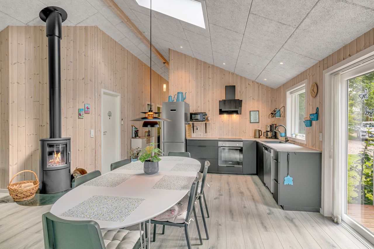 Husets hjerte er det charmerende køkken/ alrum / stue i et, med et flot "trold tekt " loft ført til kip, der er indbygningsspots i loftet over køkkenet,der er monteret Aut. ovenlys, som giver et fantastisk lysindfald, elegant mørkt elementkøkken, og plads i stue/ alrum, til spisebord samt til hyggelig opholdsstue med brændeovn og varmepumpe samt med 2 udgange til den smukke stor træ terrasse, med udsigt over den ugenerte have.