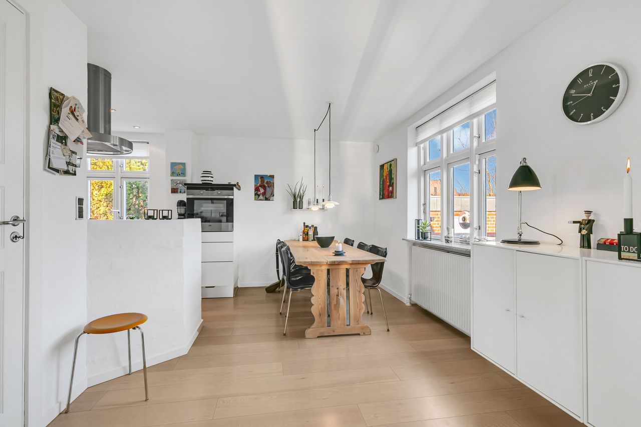 Pænt hvidt elementkøkken, med mørk bordplade, god sep. spiseplads, flot pålagt gulv, vandskurede vægge, gipsloft med indbygningsspots og hvid dobbeltdør med sprosser til stuen.