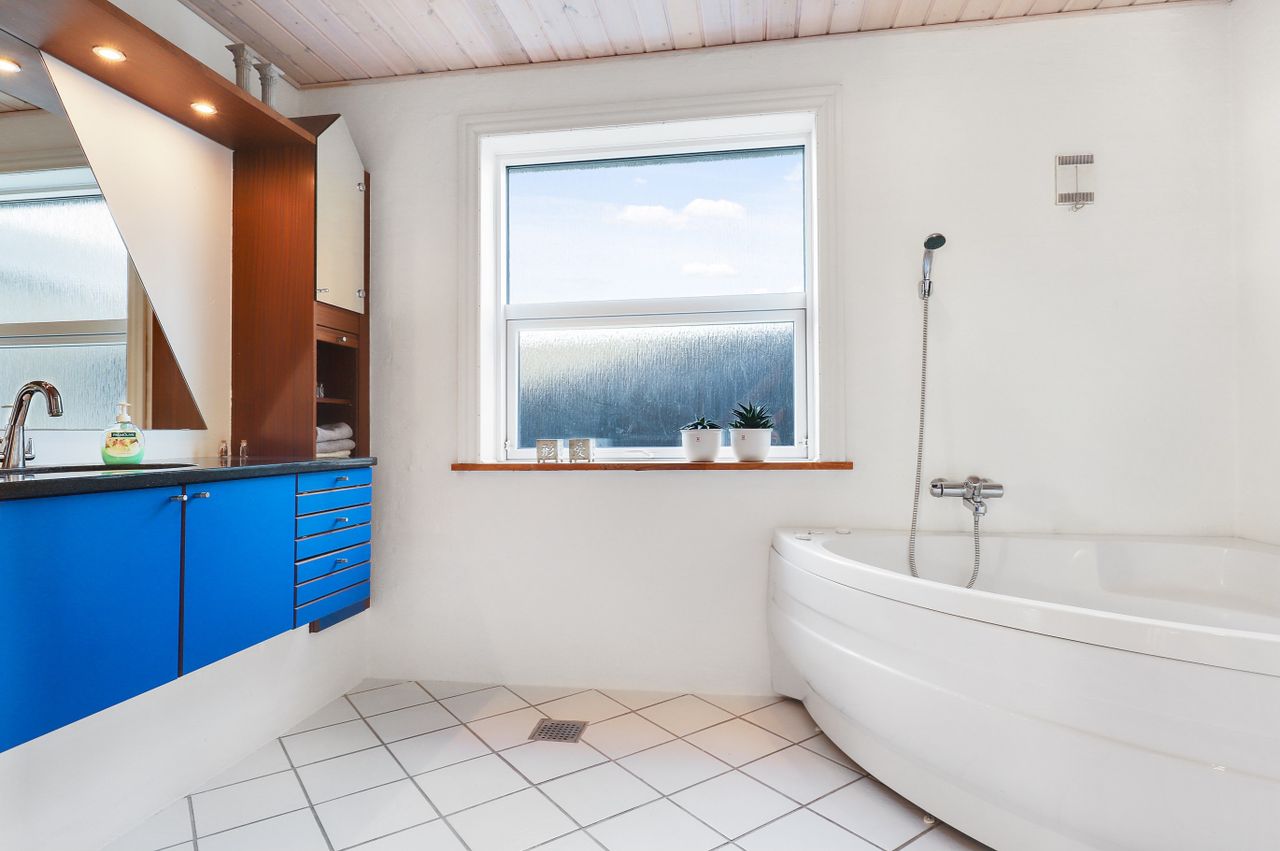 På 1 sal forefindes : Pænt lyst badeværelse med sep. bruseniche, hvide klinker samt nydeligt badeværelses miljø skab med ophøjet håndvask og med ovenlys vindue.
