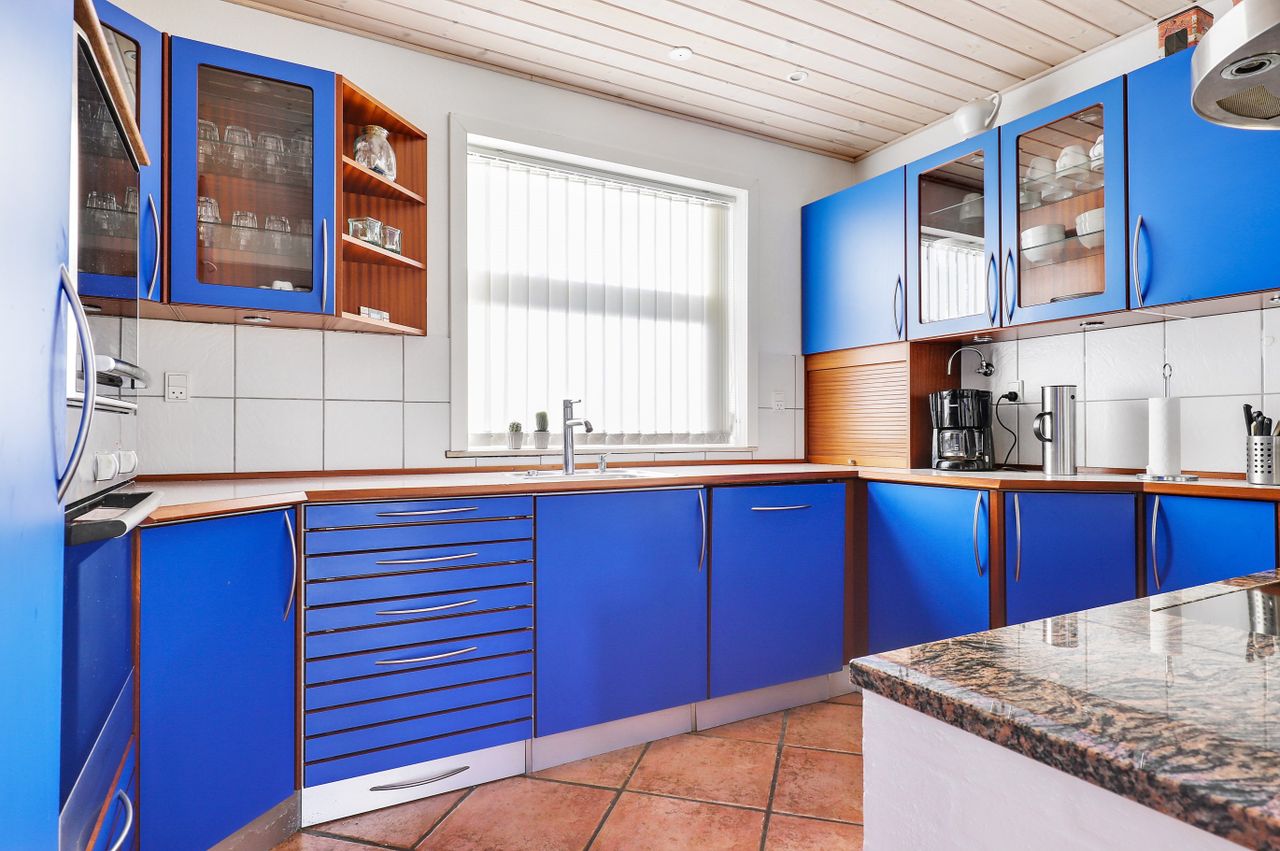 Utrolig stort lyst køkken/alrum med halv mur til spise afdeling. Der er pænt diagonalt, klinkegulv pålagt som går igen i stuerne samt i entre/hall og bryggers. Der er særdeles god plads til stort spisebord og der er udgang til have samt stor solrig delvis overdækket flise terrasse. Pænt element køkken med sokkel skuffer i mørk træ sort endvidere med flot farvede låger og med alt i hårde hvidevarer og med indbygnings spots i loftet.