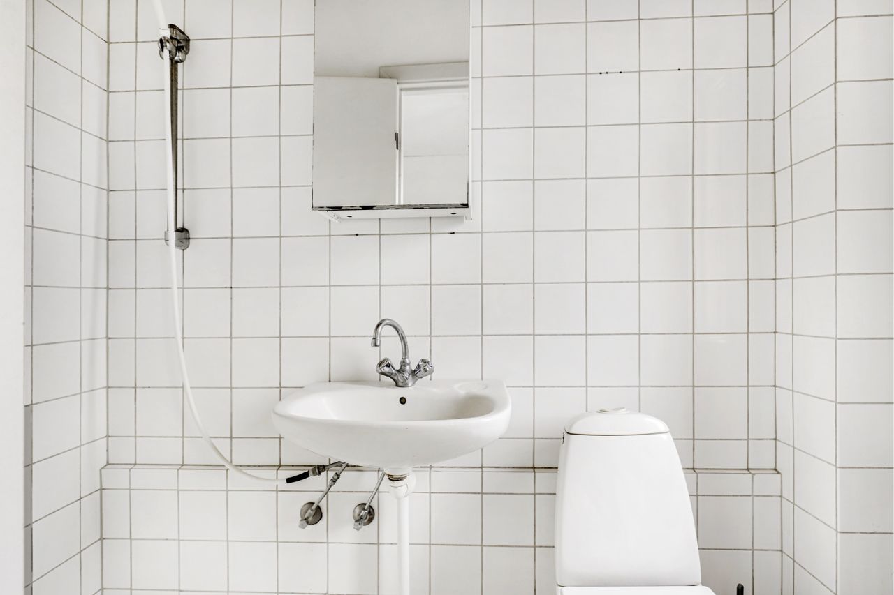 Fra soveværelset er der adgang til badeværelse med ensfarvede hvide klinker på gulv samt vægge, sep. bruseniche, toilet samt håndvask.