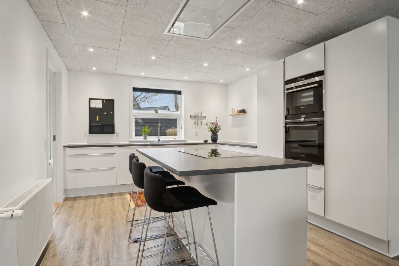 Særdeles flot hvidt køkken, med hvide køkkenelementer, kogeø, flot mørk bordplade, " troldtekt " loft med indbygningsspots pænt laminatgulv og i åben forbindelse til skøn møblerings venlig stue.