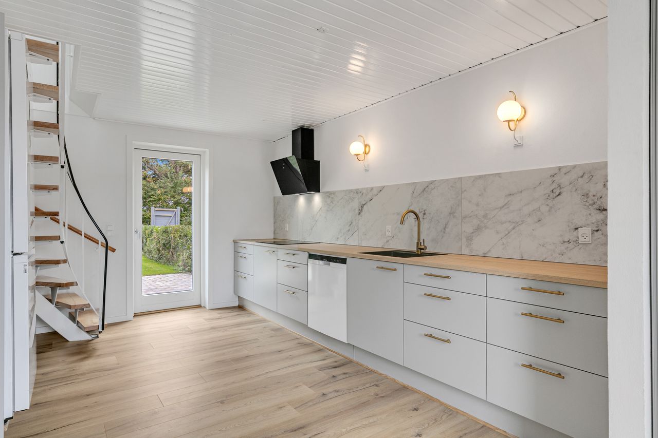 Indvendigt tilbydes følgende indretning : Stort særdeles flot nyt køkken, med flotte køkken elementer, greb i mat. messingfinish, nydelig bordplade, nydelig væglamper og mat. messingfinish armatur, nydeligt lyst laminatgulv, trappe til 1 salen, samt med udgang til den skønne solrige flise terrasse samt flot anlagte have.