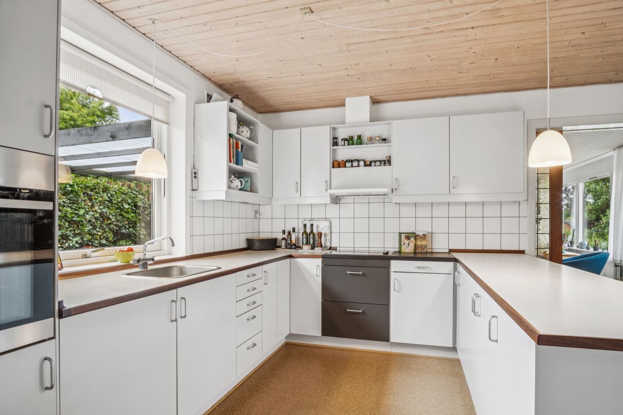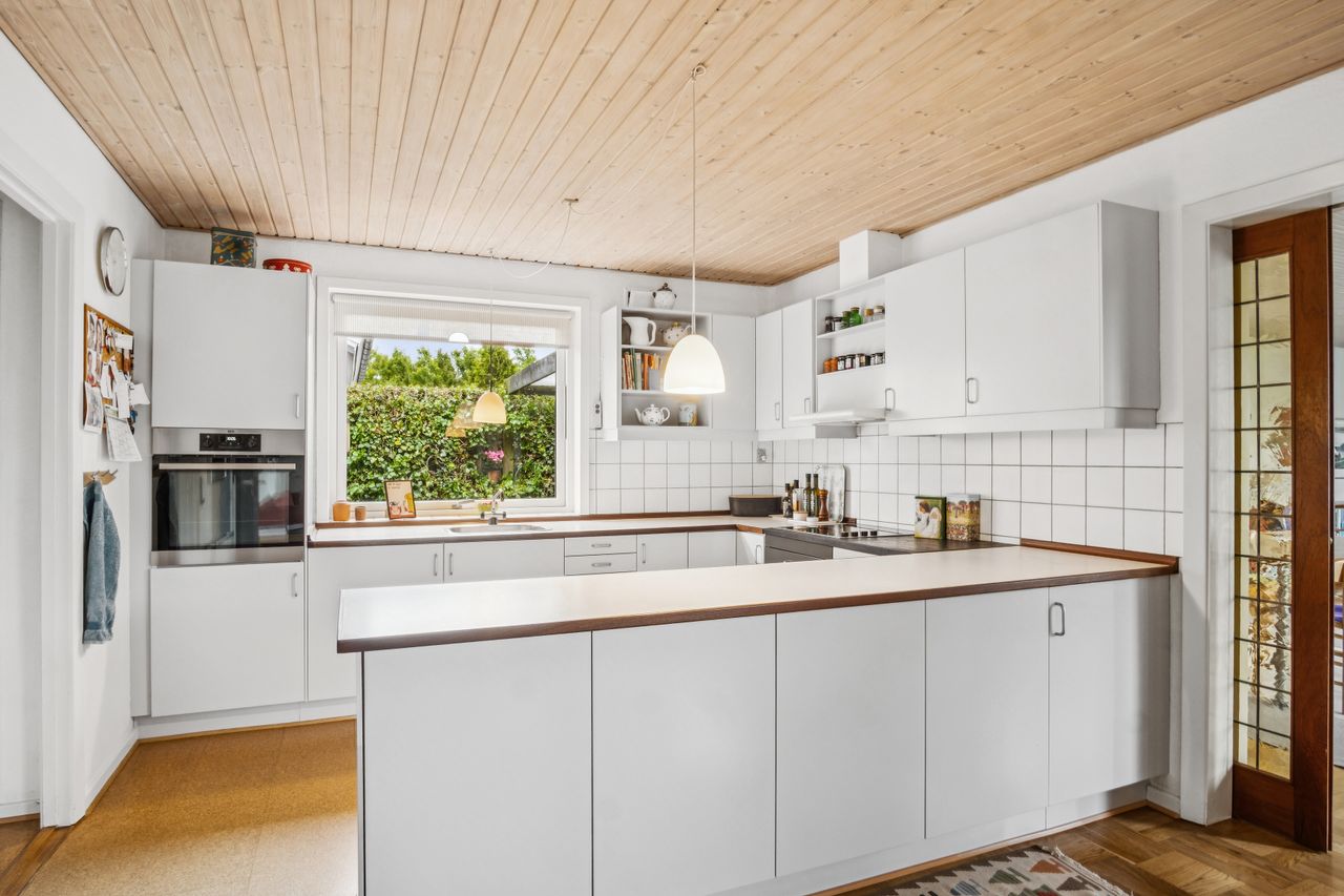 Super lækkert køkken/alrum, med stort panorama vindue til haven, god plads til stort spisebord og nydeligt lyst køkken og med skydedør isat til stuen.
