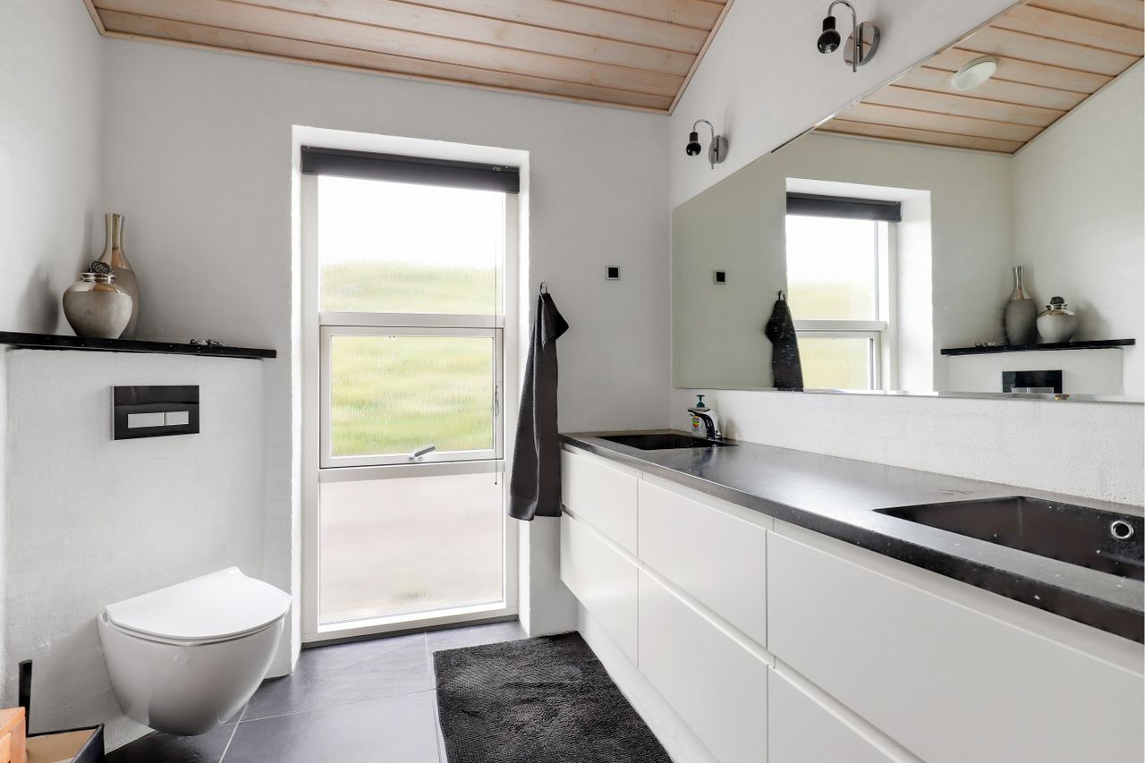 armaturer, ophængt toilet, vandskuede vægge, skrå loft samt vindue isat fra gulv til loft.