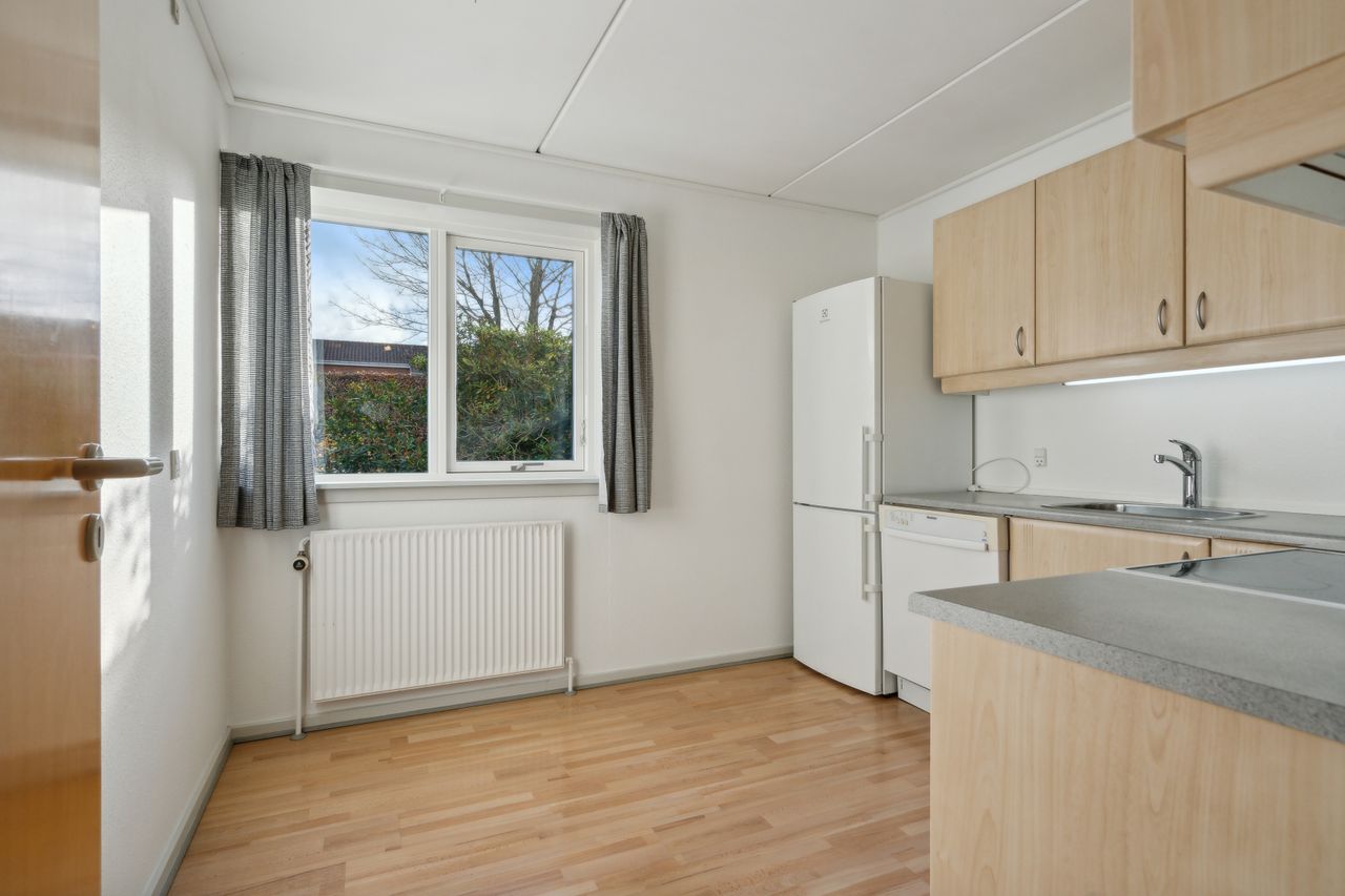 Pænt lyst køkken, med finerede låger, laminatgulv og mulighed for etablering af køkken/alrum, plads til sep. spiseplads.