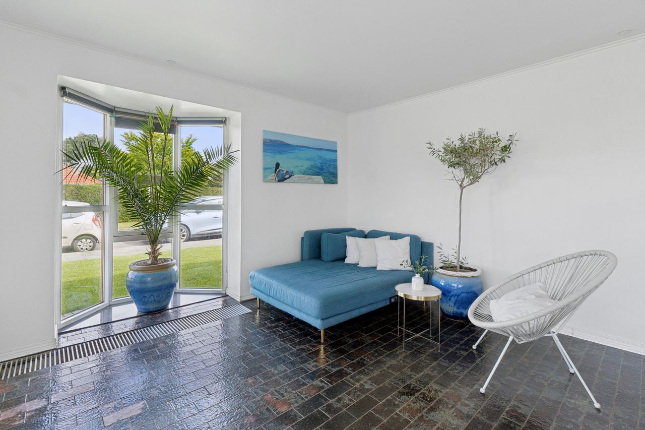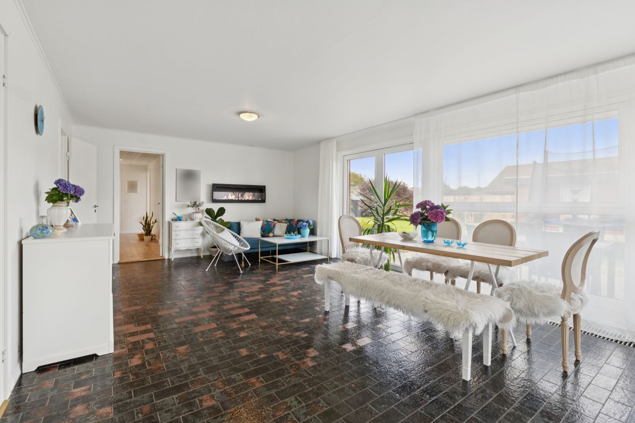 Pæn stor lys opholdsstue med flot klinkegulv med gulvvarme og med særdeles gode møbleringsmuligheder, til opholdsstue samt spisestue, endvidere med dør til haven samt den store solrige fliseterrasse.