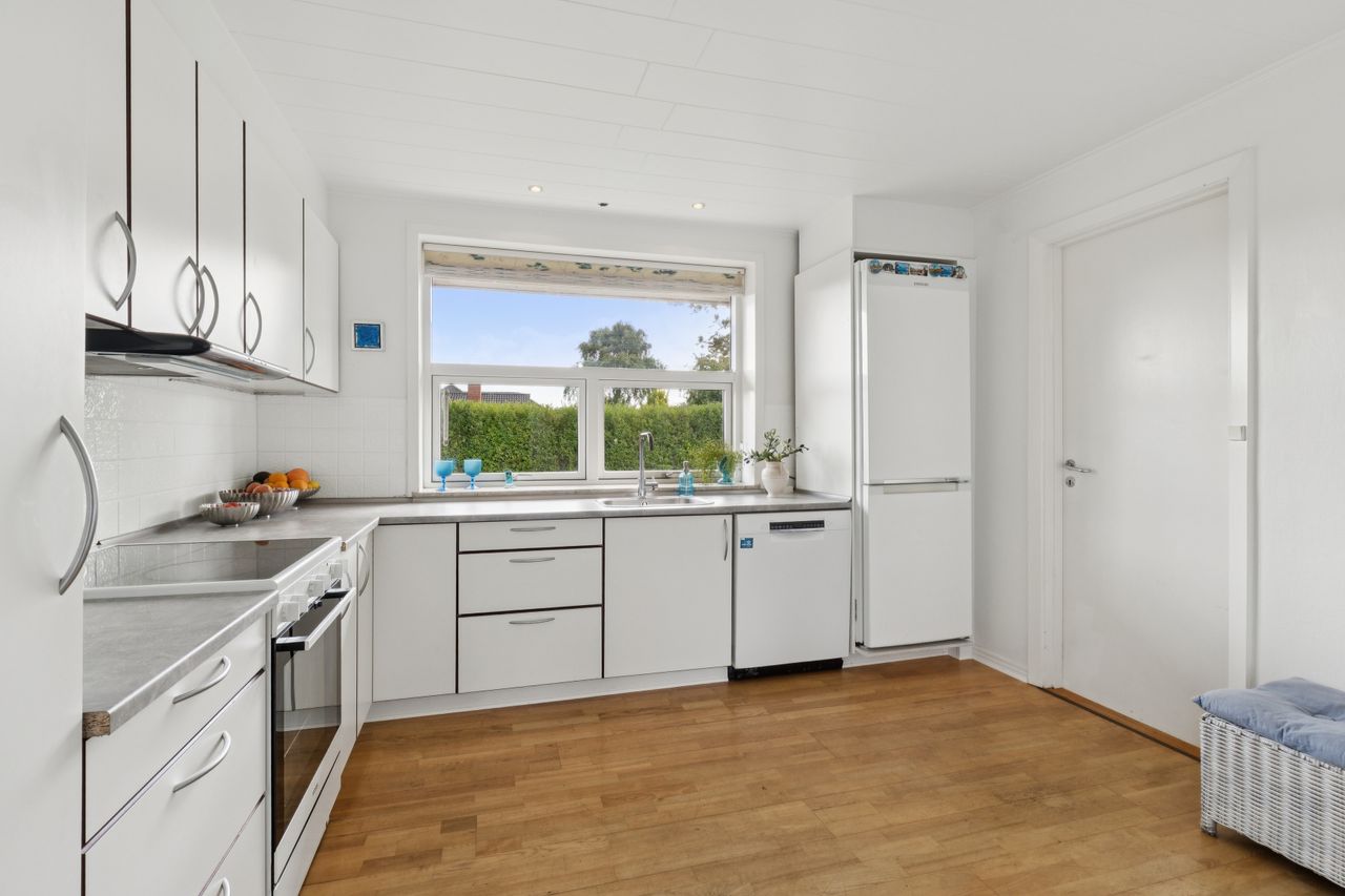 Pænt stort lyst køkken med hvide køkkenelementer og med plads til spisebord.