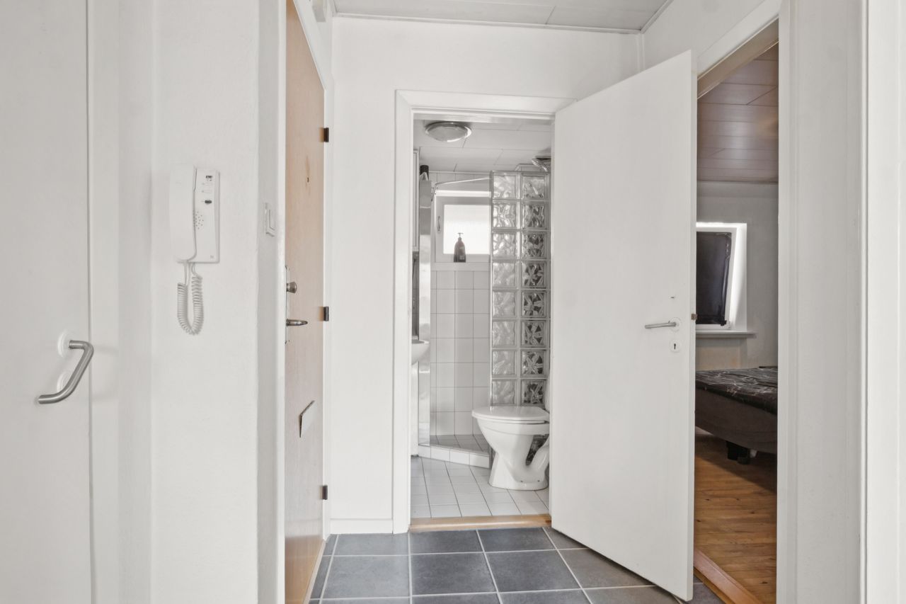 Indvendigt tilbydes følgende indretning : Pæn lys entre, med god plads til garderobe, indbygget garderobe skab samt et pænt pålagt klikgulv.