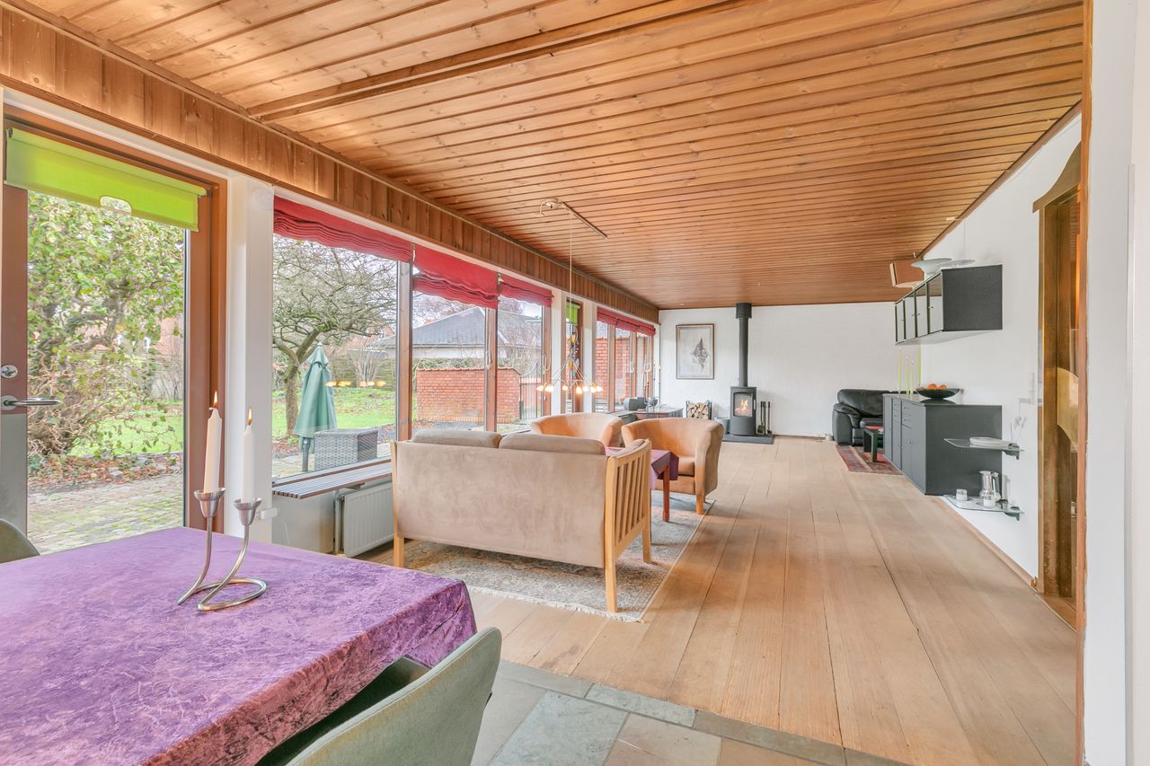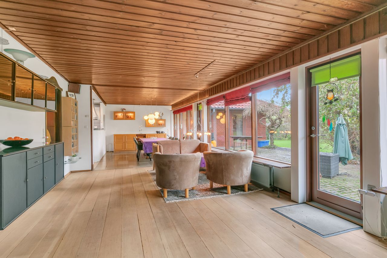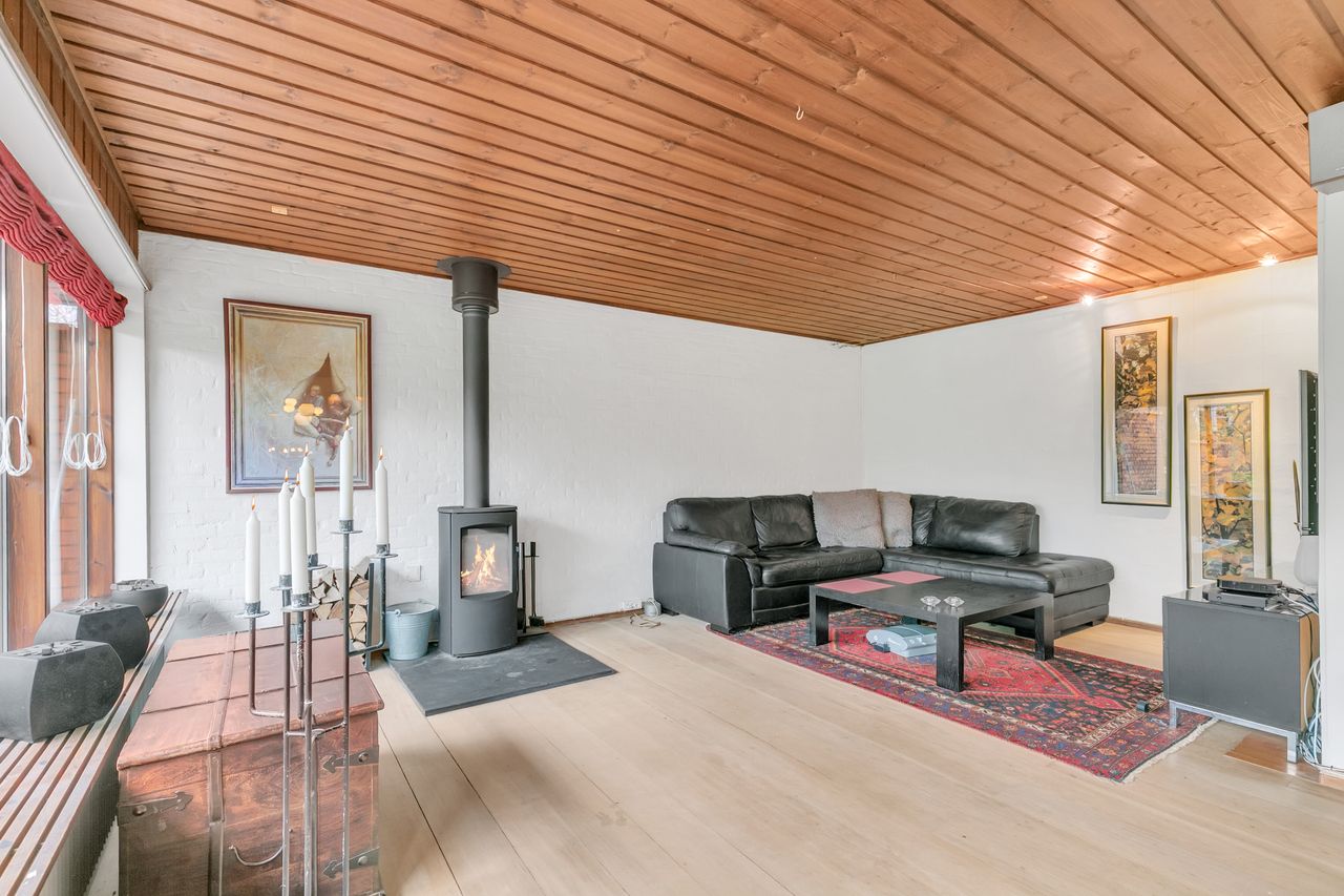Særdeles stor stue, hvor der er indrettet spisestue, med plads til stort spisebord og nydeligt klinkegulv og i åben forbindelse til den store vinkelopholdsstue, med massivt trægulv og vandskuret endevæg, der er med udgange til den store flotte solrige chaussestens terrasse, haven samt swimmingpoolen. Der er installeret brændeovn i stuen.
