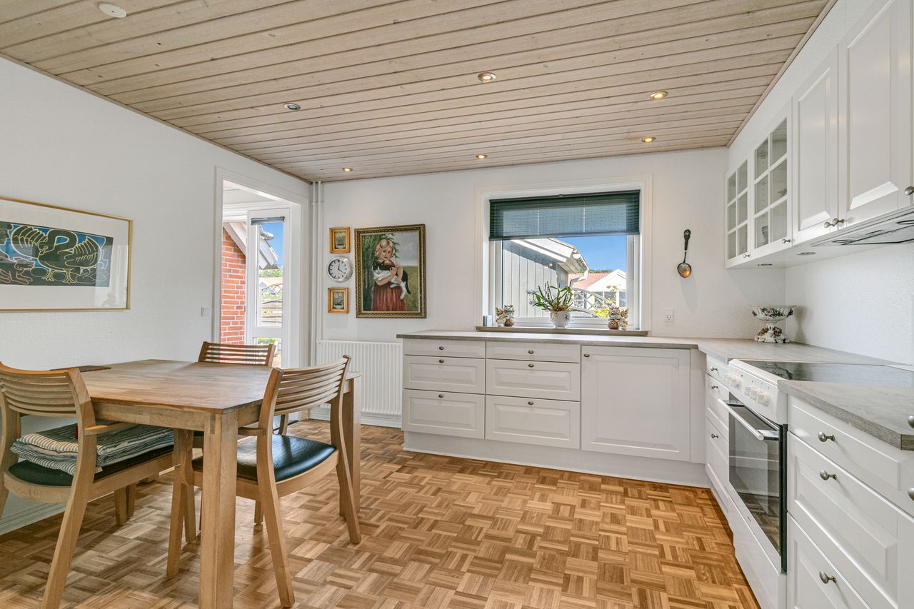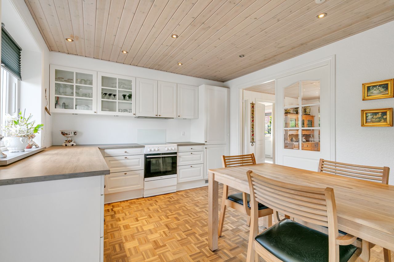 Dejligt stort lyst køkken, med hvide elementer og nydelig bordplade, indbygningsspots i loftet samt sep. spiseplads.