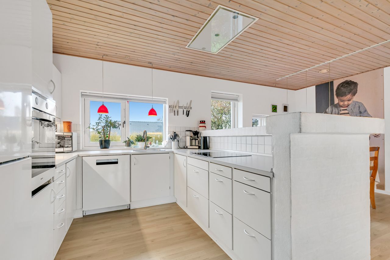 Stort lyst køkken/alrum, med hvidt køkken og muret halvvæg til alrummet, hvor der er plads til stort spisebord og med udgang til fliseterrasse samt haven.
