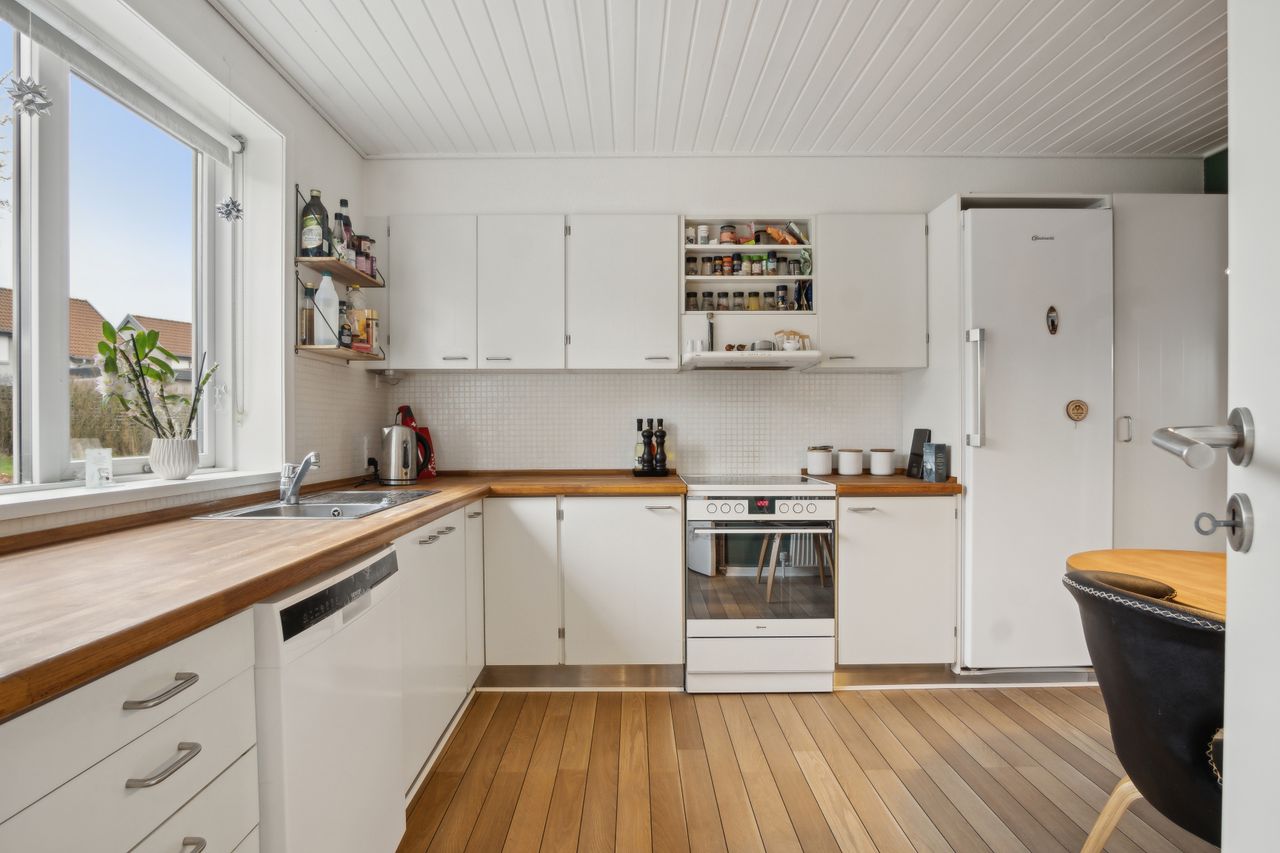 Dejligt lyst køkken, med et hvidt elementkøkken, nydeligt pålagt " Skibs planke " laminatgulv, massiv bordplade, et malet rustik loft samt plads til spiseplads.