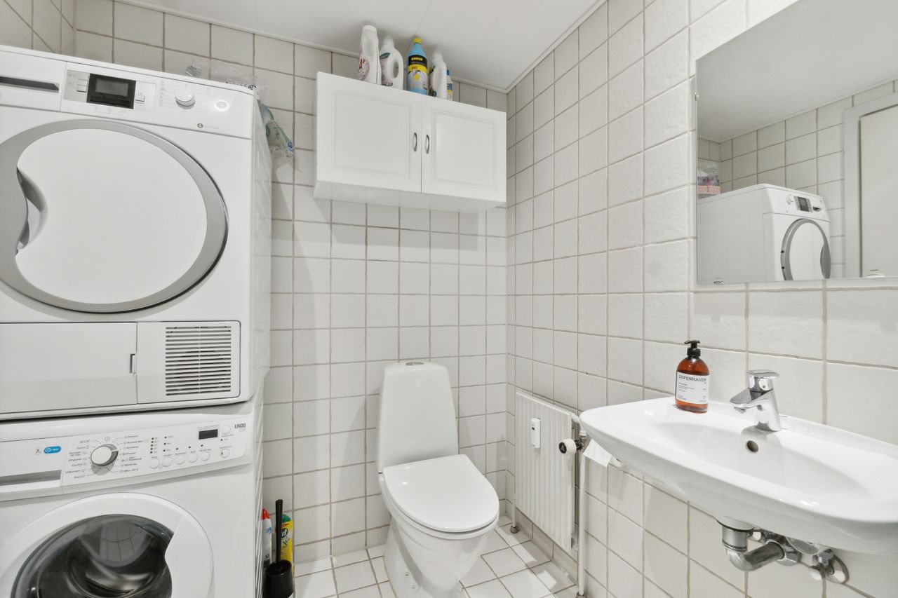 Pænt stort lyst badeværelse, med hvide klinker på gulv samt vægge, plads til vaskemaskine & tørretumbler, stor sep. bruseniche, med glasvæg, gulvvarme mv.