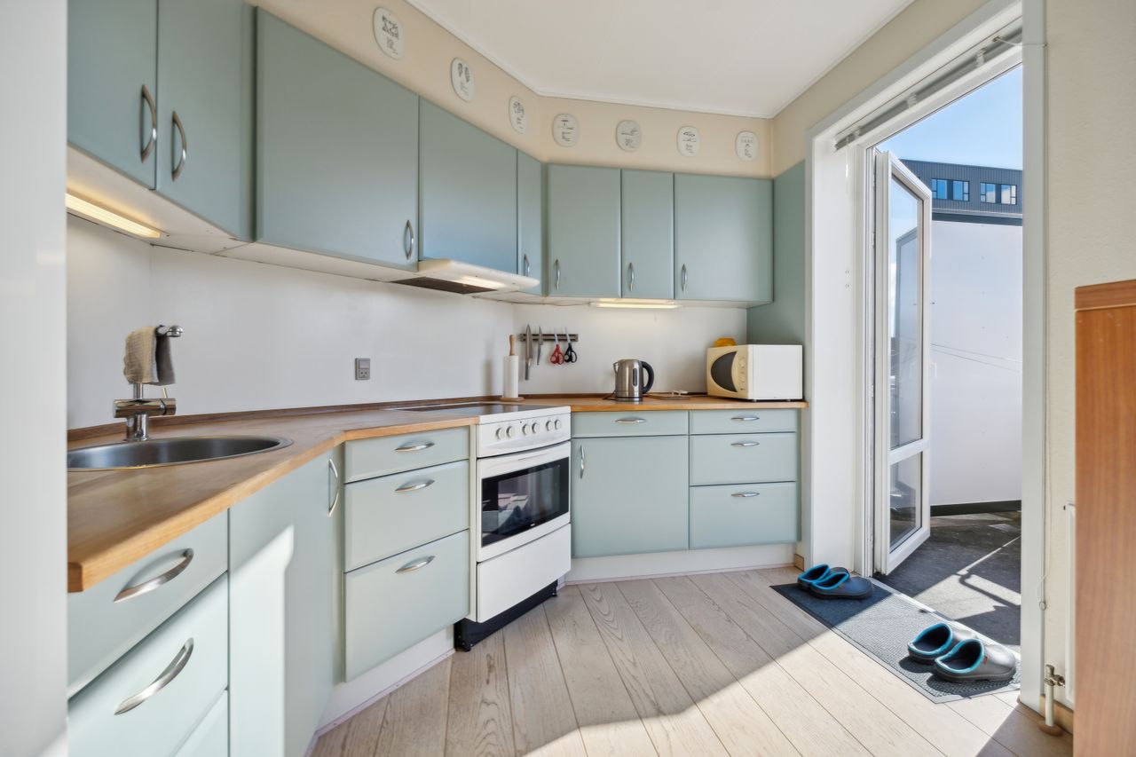 Særdeles lækkert stort køkken / alrum / stue i et, med panorama vinduer, med god udsigt og fra køkkenet er der udgang til den store solrige altan. Køkkenet er med malede låger som er facet slebet, der er god plads til stort spisebord og gode møblerings muligheder for indretning af hyggelig opholdsstue, der er pålagt et nydeligt laminatgulv..