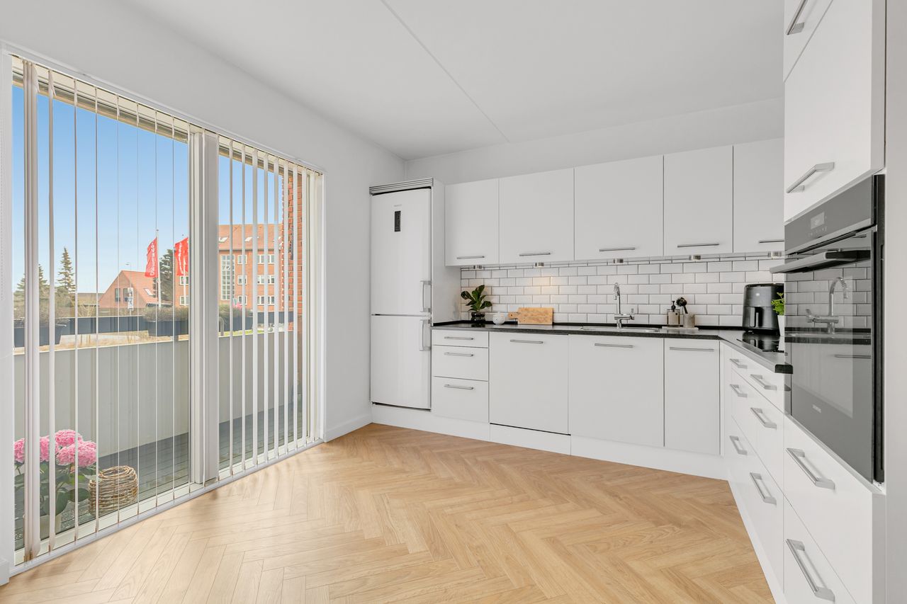 Stort køkken, med et flot hvidt elementkøkken, nydelig mørk bordplade, med afrundede kanter, alt i hårde hvidevarer, plads til køkkenbord, udgang til solrig stor altan med trægulv, desuden en flot radiatorskjuler.