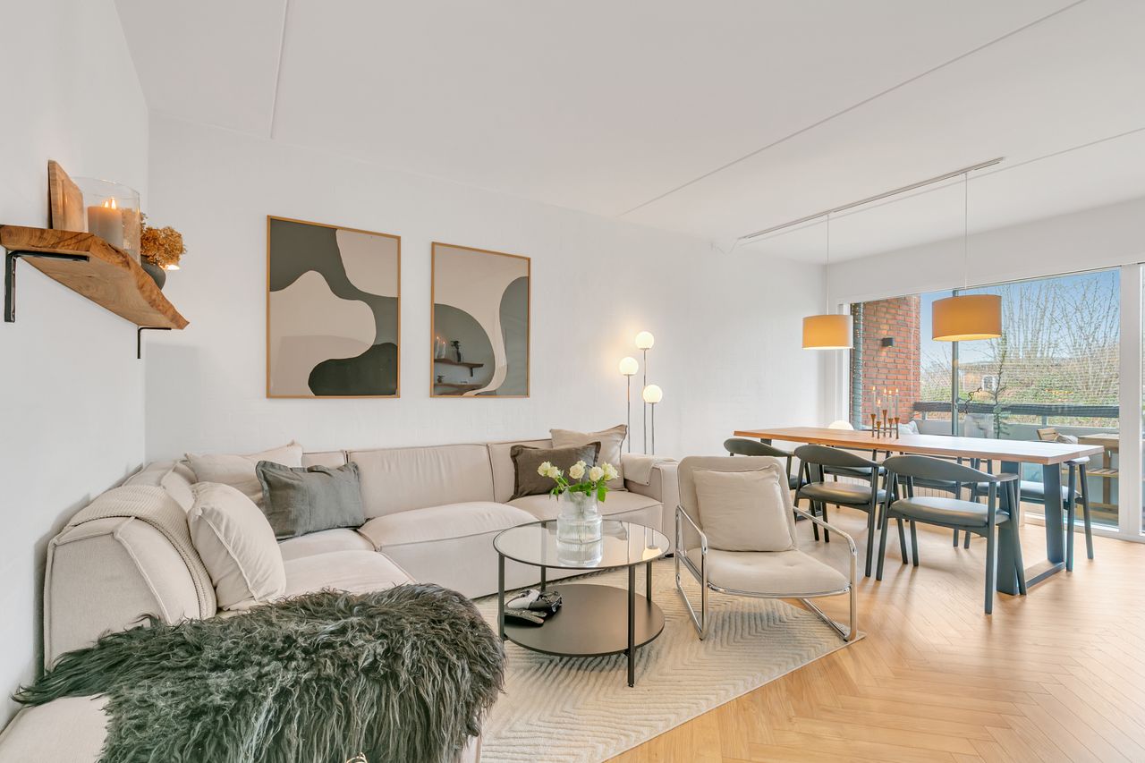 Nydelig stor lys opholdsstue, med god plads til stort spisebord og mulighed for indretning af hyggelig opholdsstue, der er desuden udgang til skøn stor solrig altan, med aftensol, der er desuden flot radiatorskjuler.