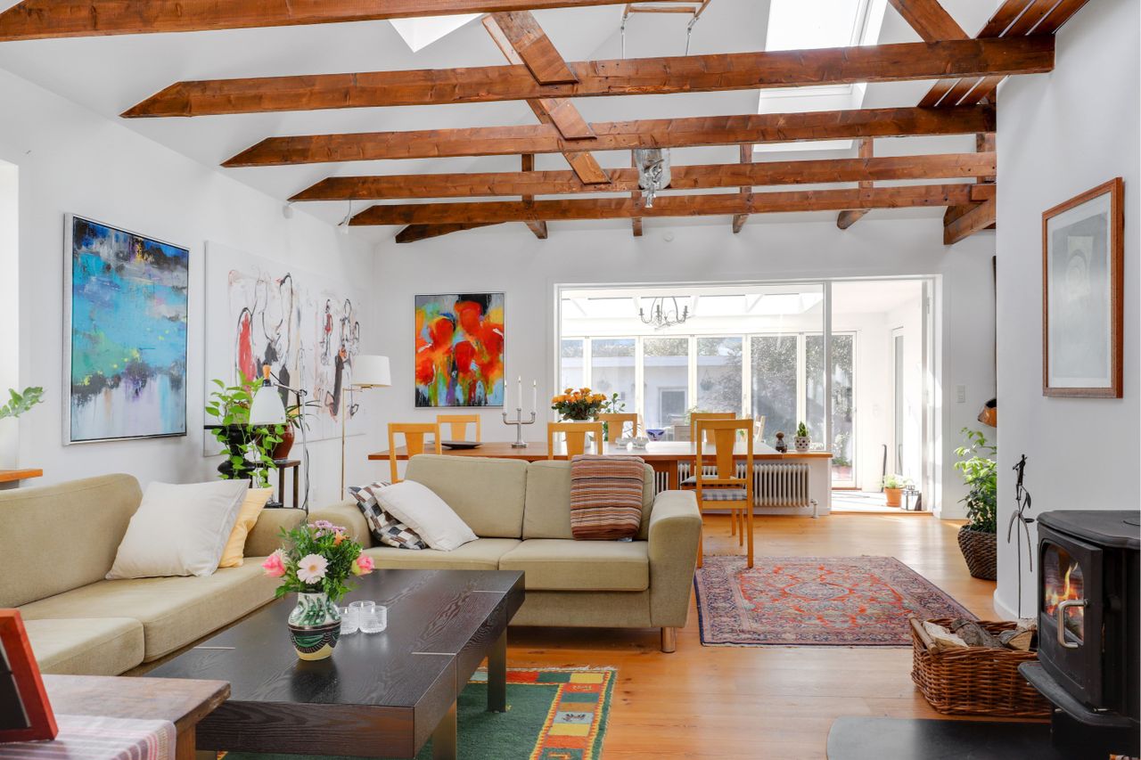 indretning, af hyggelig opholdsstue samt særdeles god plads til stort spisebord, flotte synlige hanebånd,