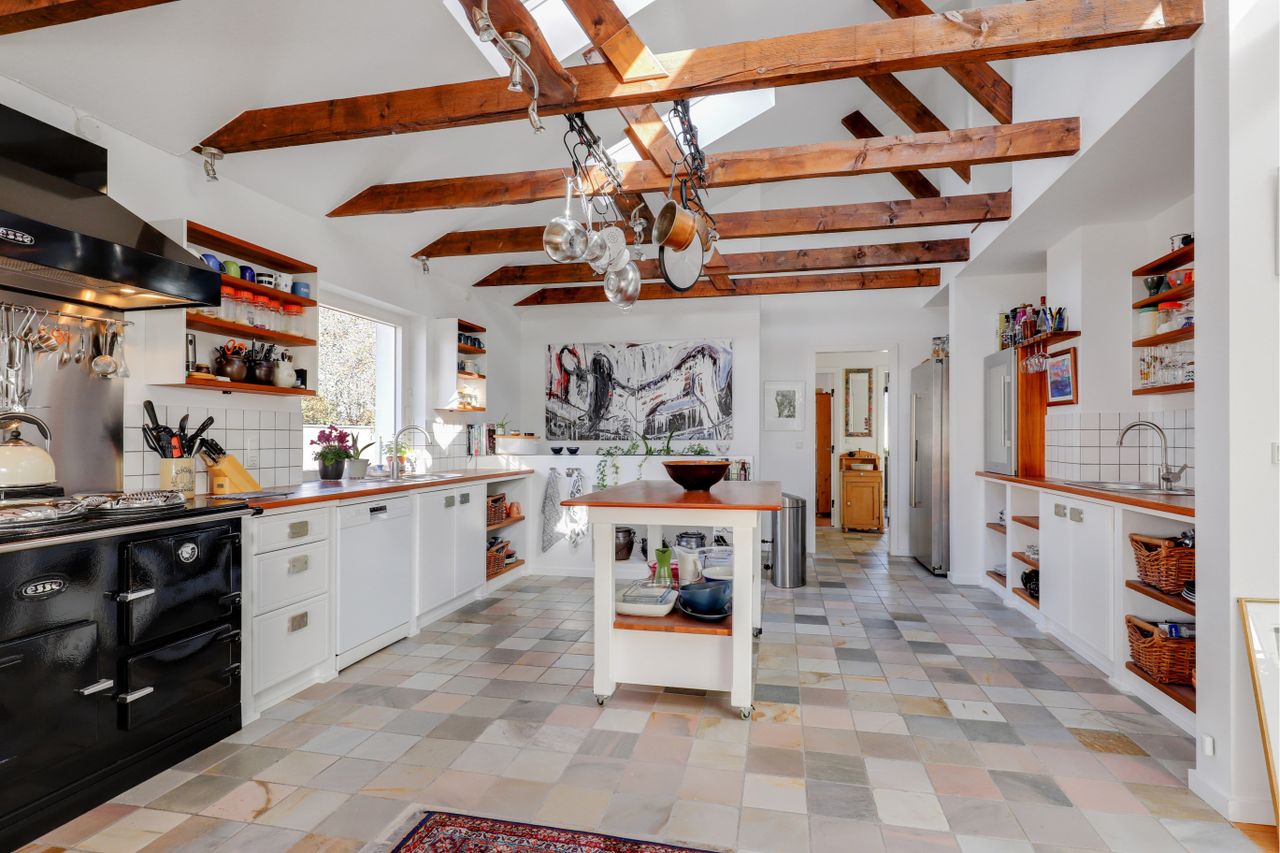 klinker " på gulvet, 4 store ovenlys vinduer, som giver et flot lys indfald, utrolig flotte synlige hanebånd, loft