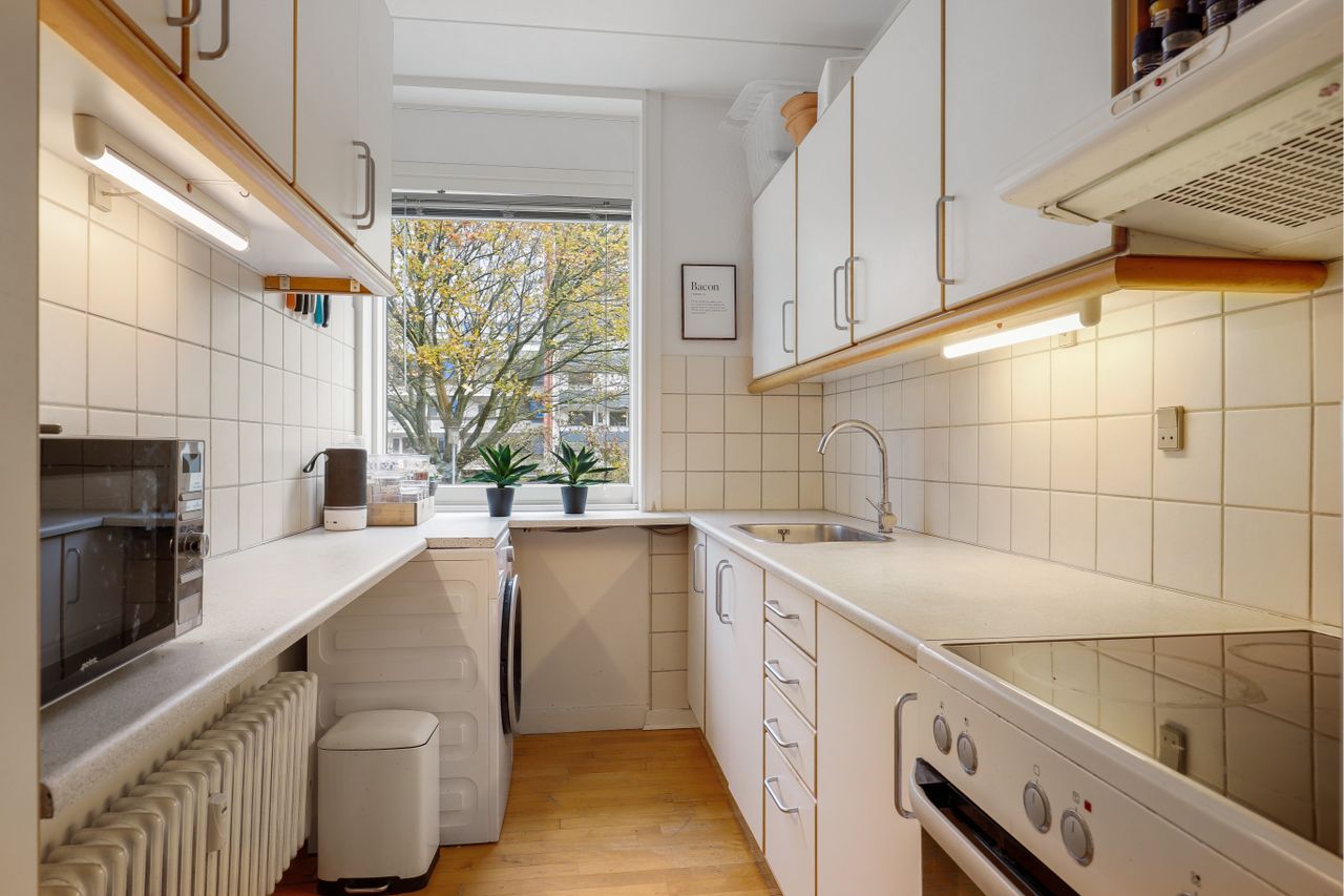 Køkken med massivt trægulv, lyst elementkøkken og plads til vaskemaskine.