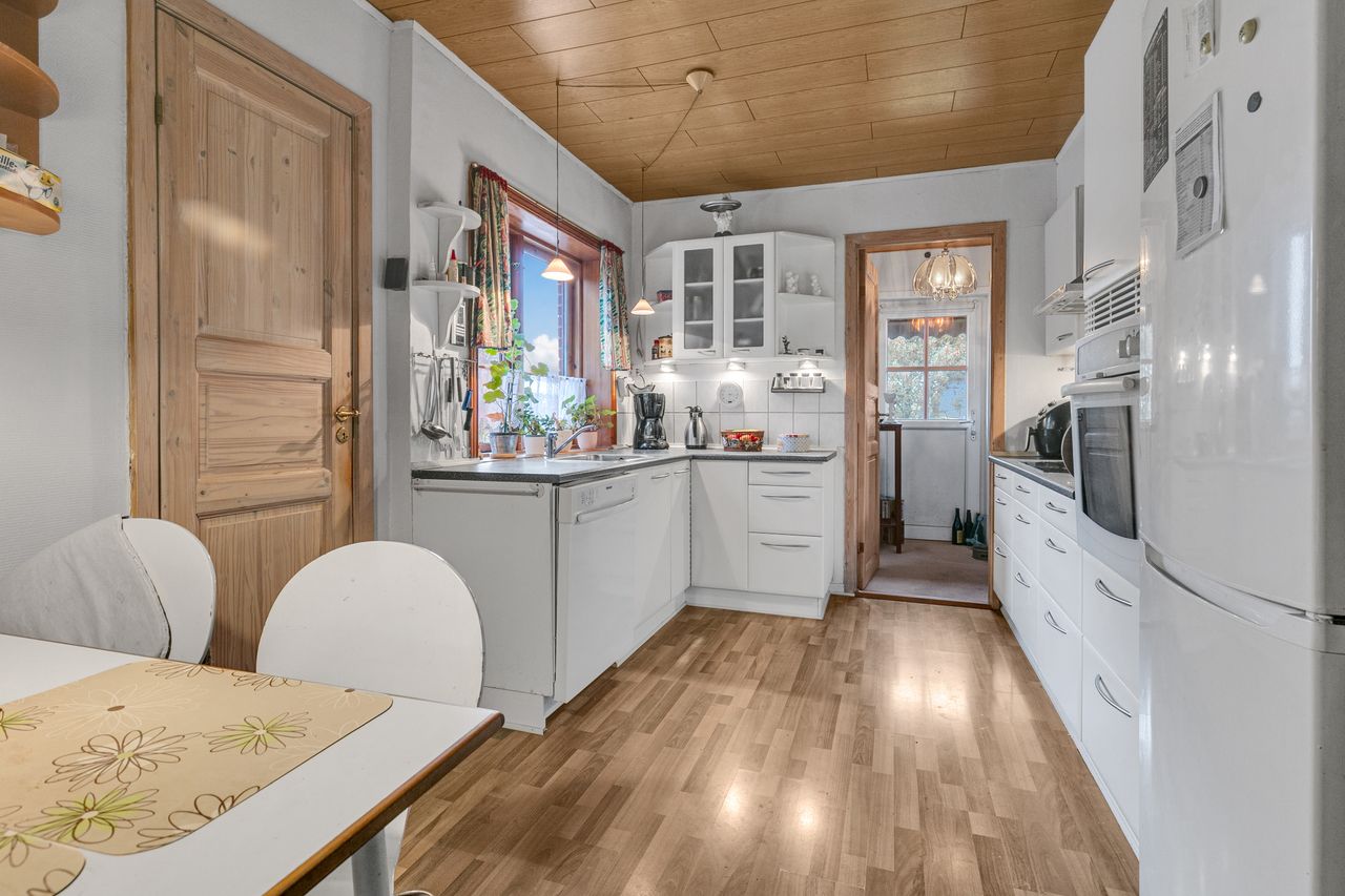 Dejligt køkken, med lyse køkkenelementer og god sep. spiseplads.