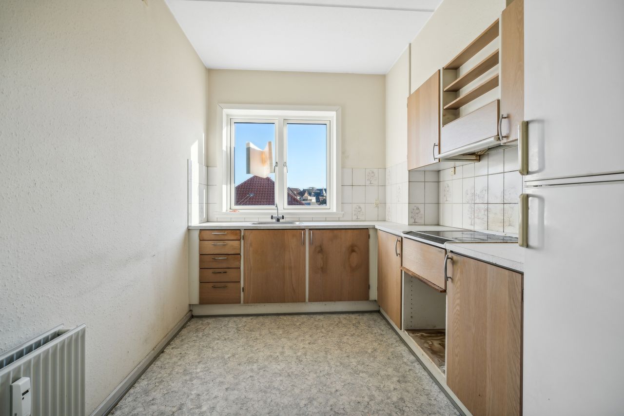Hele Andelsboligen trænger til renovering, med nye laminatgulve samt nyt køkken og hårde hvidevarer.