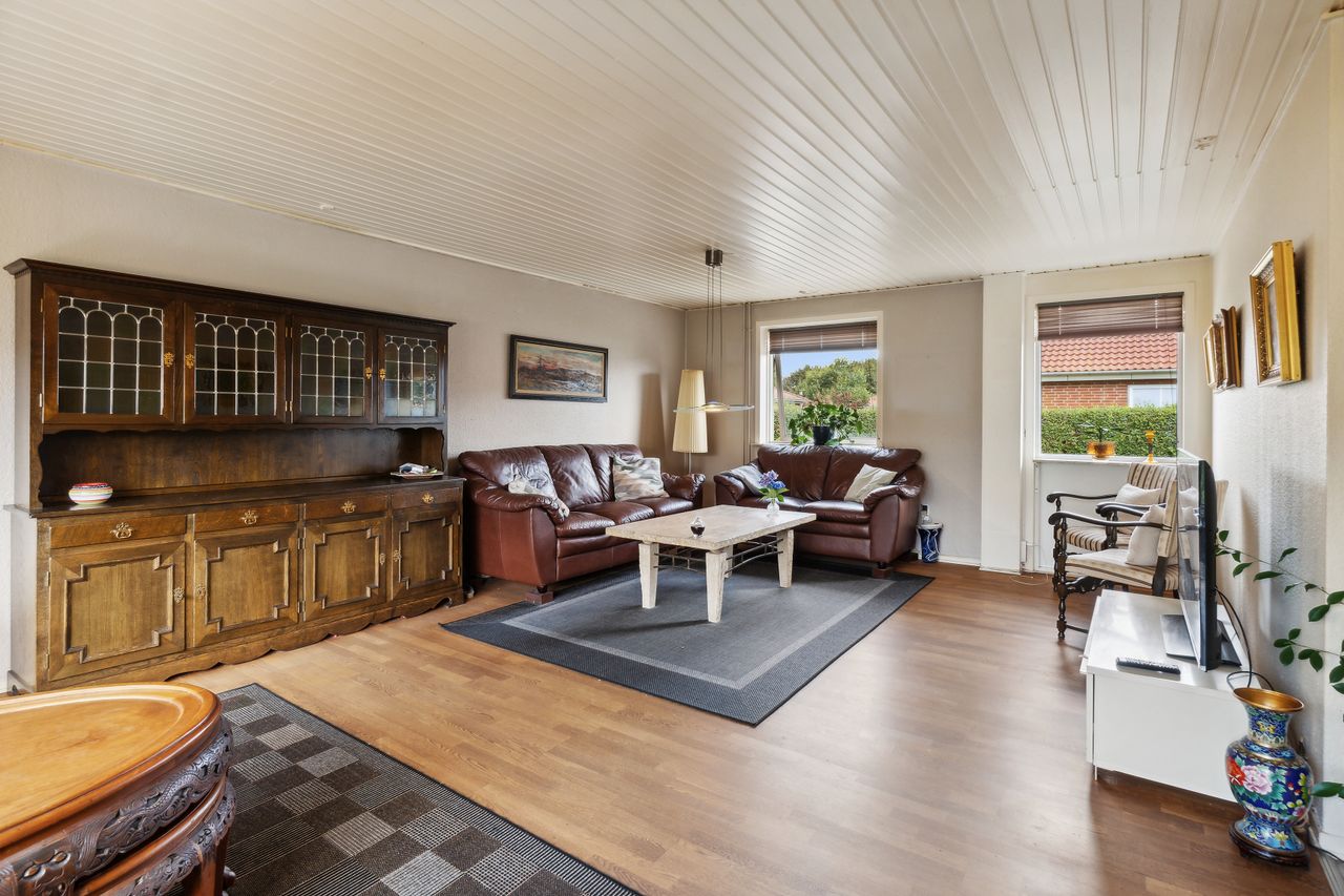 Stort køkken / alrum / stue i et, med et pænt lakeret element køkken, diagonalt liggende klinkegulv i køkkenet samt i alrum, hvor der er plads til stort spisebord og med udgang til haven. Stuen er særdeles møblerings venlig med et laminatgulv pålagt og med udgang til haven.