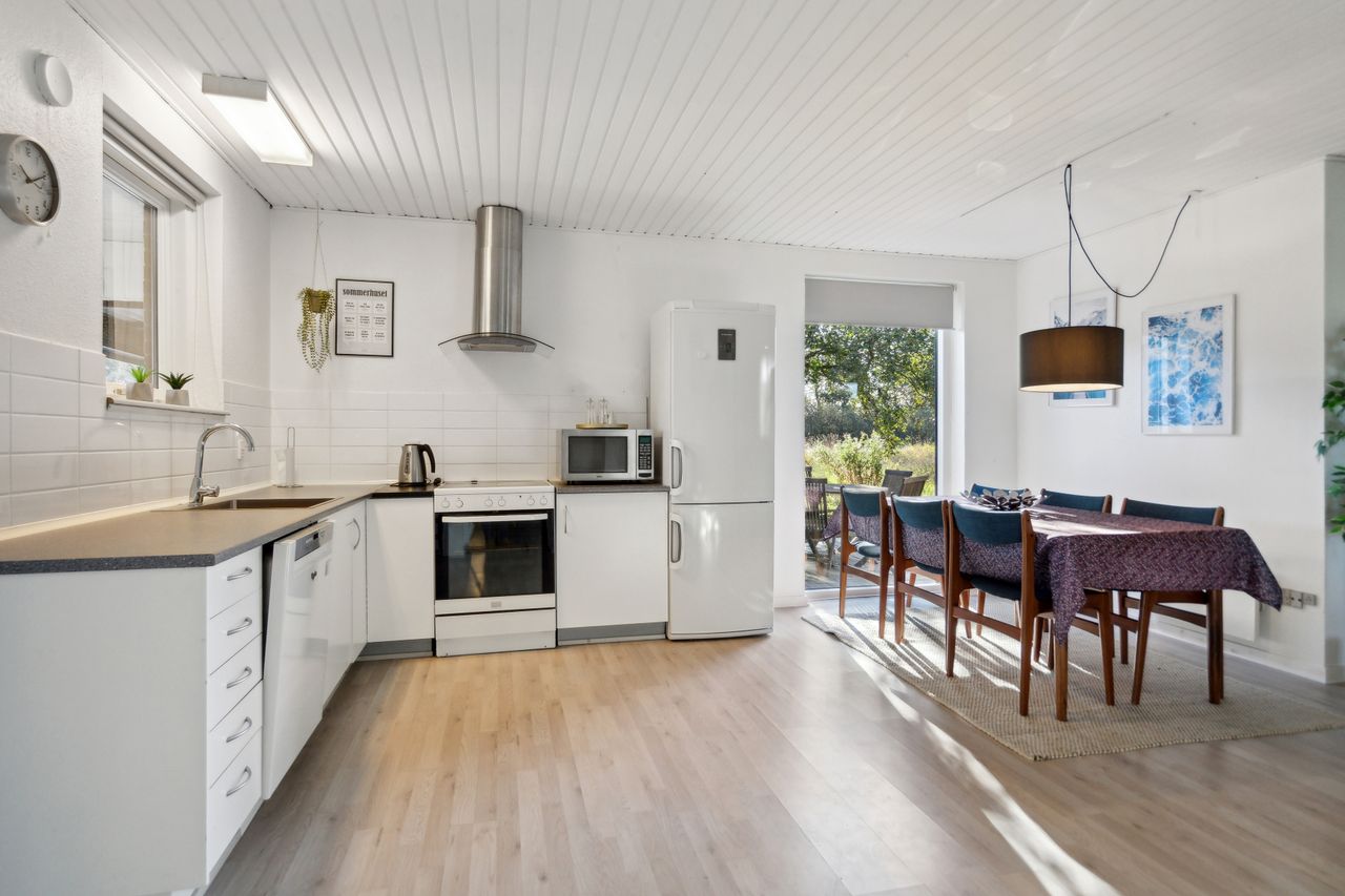 Dejligt stort lyst køkken / alrum / stue i et, med et pænt hvidt elementkøkken, plads til stort spisebord og hyggelig opholdsstue med gode møbleringsmuligheder, udgang til den skønne store solrige træterrasse, brændeovn og varmepumpe.