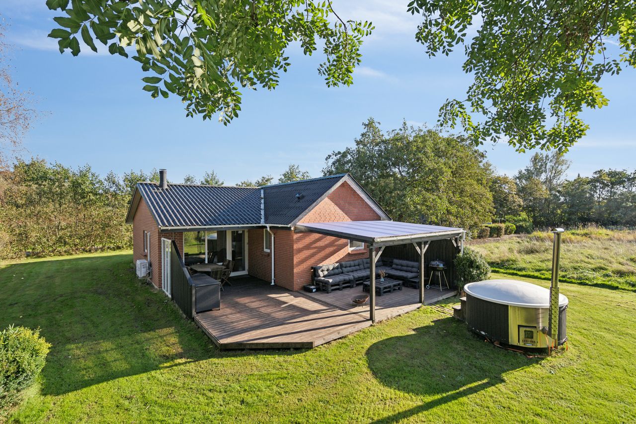 Der er en særdeles stor træterrasse, hvor der er en overdækket del, så man kan sidde om aftenen og nyde udsigten til naturen.