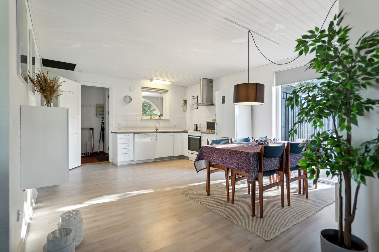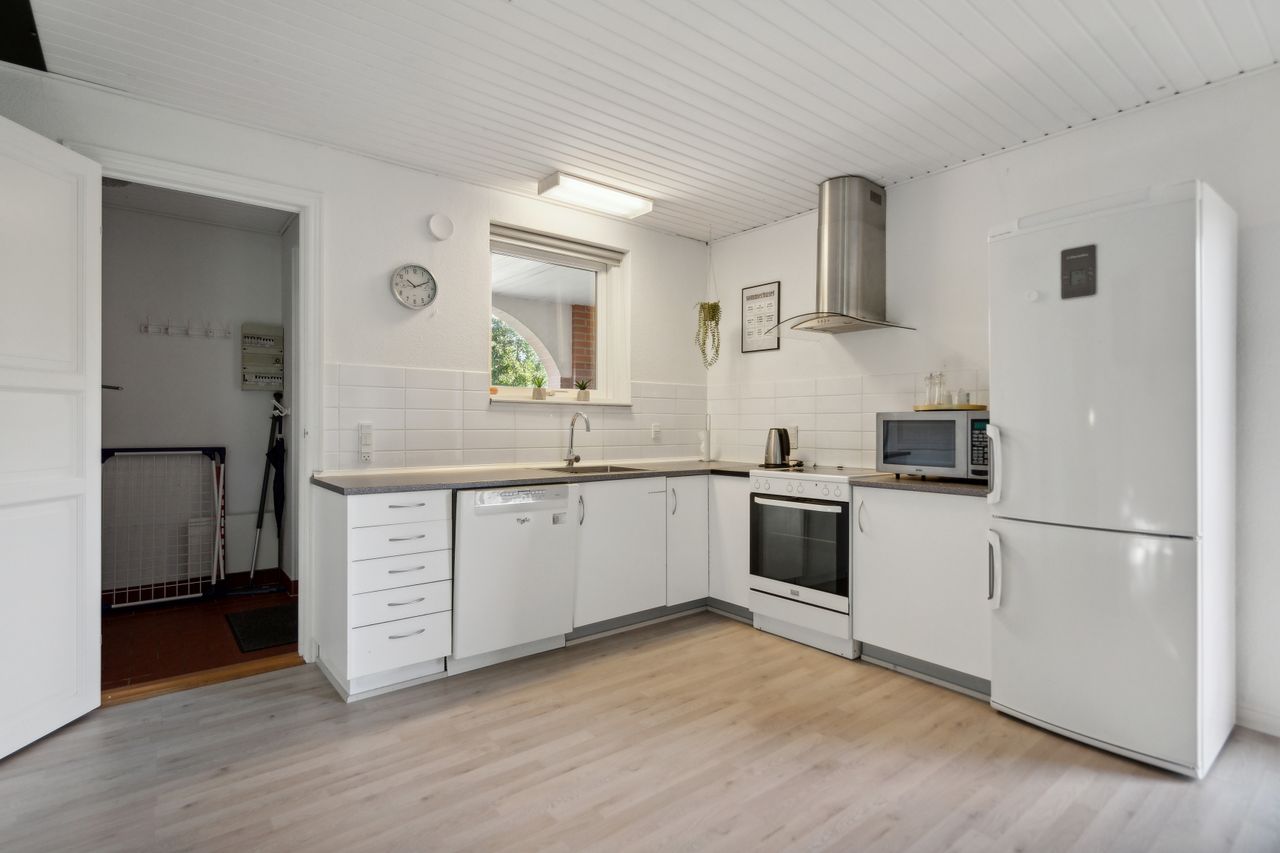 Hele huset har malede rustiklofter samt flotte indvendige døre samt lyst laminatgulv pålagt.