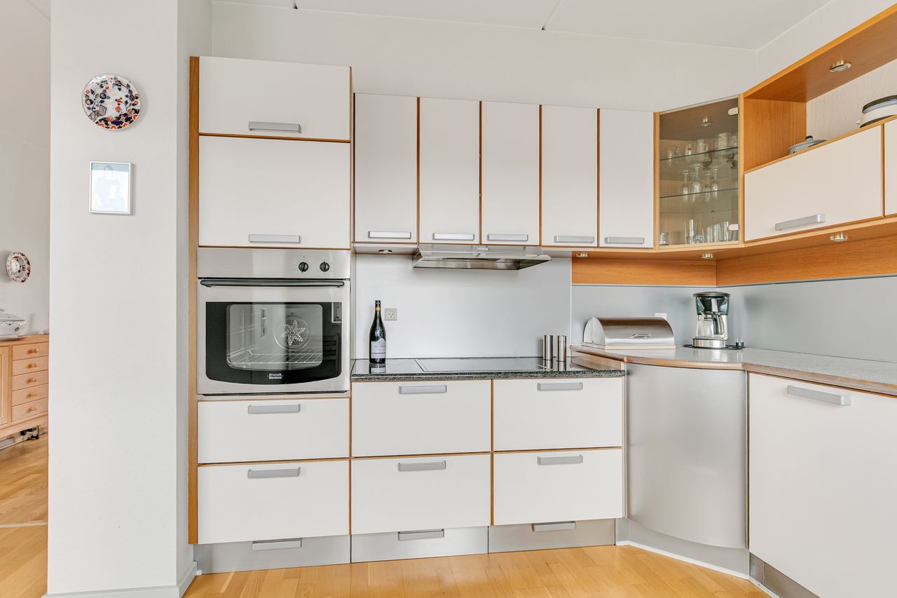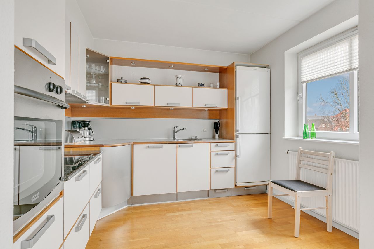 Nydeligt køkken med flotte køkkenelementer, plads til mindre køkkenbord og desuden med alt i hårde hvidevarer.