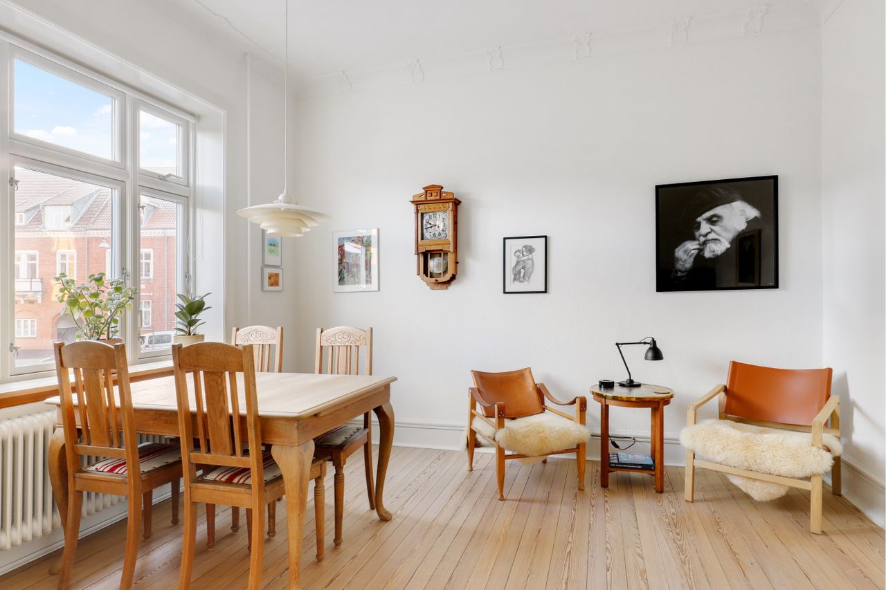 anden til spisestue, og begge stuer har flotte stuk lofter og massive trægulve.
