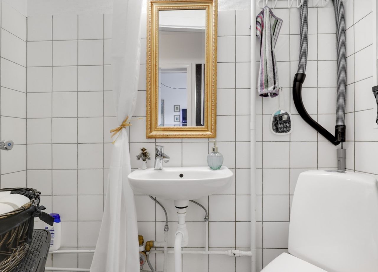 klinker på vægge og sep. bruseniche, håndvask samt toilet.