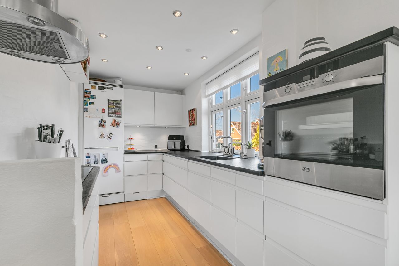 Pænt hvidt elementkøkken, med mørk bordplade, god sep. spiseplads, flot pålagt gulv, vandskurede vægge, gipsloft med indbygningsspots og hvid dobbeltdør med sprosser til stuen.