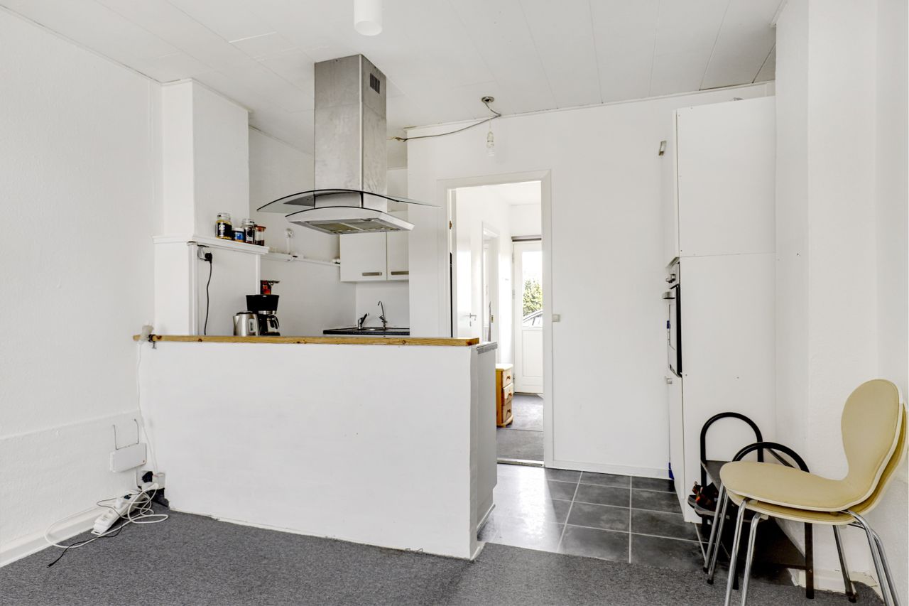 Indvendig tilbydes følgende indretning : Dejlig lys rummelig møbleringsvenlig stue, hvor der er plads til spisebord samt for indretning af opholdsstue, i åben forbindelse til køkkenet, med adskillelse i form af en halv væg til køkkenet.