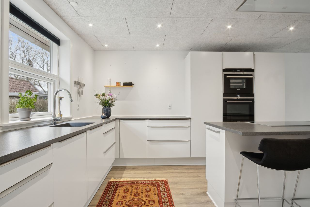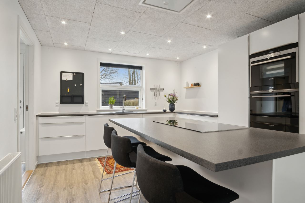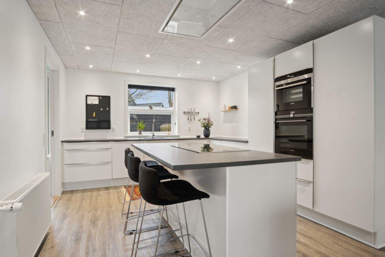 Særdeles flot hvidt køkken, med hvide køkkenelementer, kogeø, flot mørk bordplade, " troldtekt " loft med indbygningsspots pænt laminatgulv og i åben forbindelse til skøn møblerings venlig stue.