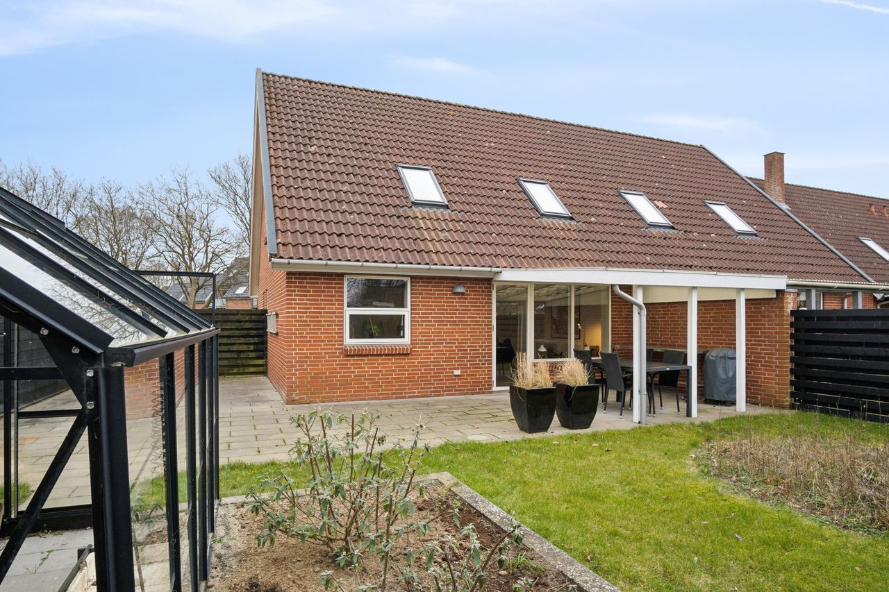 Der er flisebelagt omkring huset, grønt område med cykelsti, der fører til, skolen samt indkøbsmuligheder.