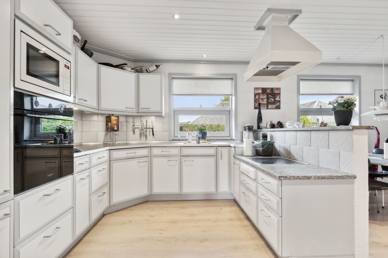 Dejligt stort lyst køkken / alrum, med et elementkøkken i hvidt, alrum med god plads til spisebord, nydeligt laminatgulv samt malet rustikloft med indbygningsspots.