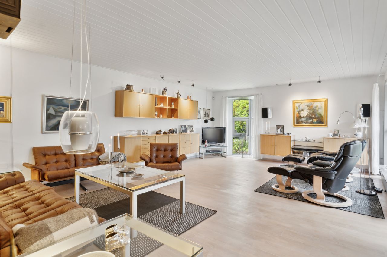 Stor lys møblerings venlig stue, med plads til spisebord samt indretnings af hyggelig opholdsstue, flot karnap, som giver et godt lysindfald, udgang til den skønne store solrige flise terrasse.