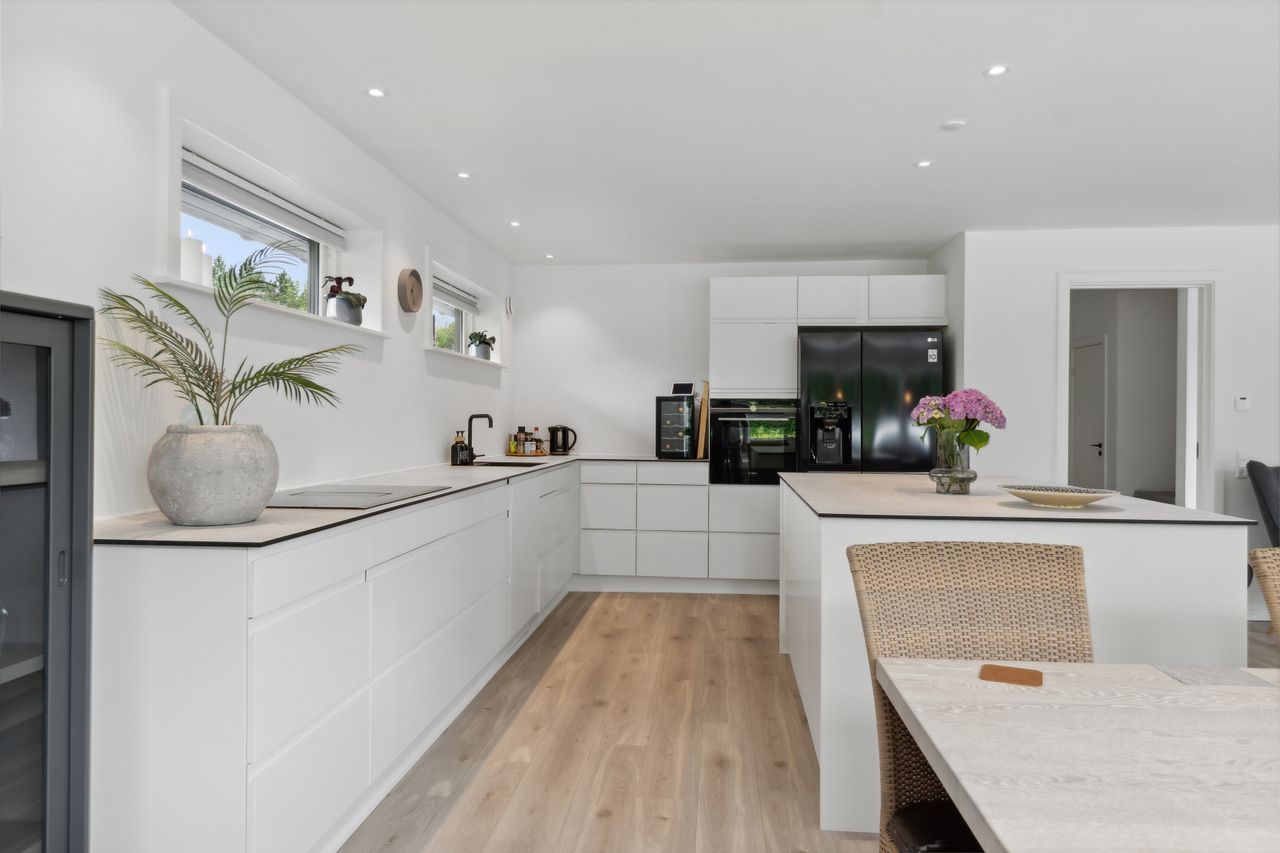 Utrolig flot stort køkken / alrum, med et flot hvidt elementkøkken og nydelig bordplade, stor flot spiseø, særdeles god plads til stort spisebord og mulighed for indretning, af hyggelig hyggekrog, med god udsigt til forhaven, indbygningsspots i loftet i køkkenet og med alt i hårde hvidevarer.