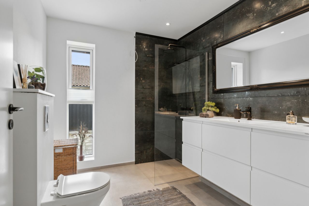 Stort flot badeværelse, nydeligt klinkegulv, ophængt toilet samt flot badeværelses miljø skab, medhåndvask, stor sep. bruseniche, med glasvæg, loftet til kip, med synlig hånebånd, gips loft med indbygningsspots, gulvvarme mv.