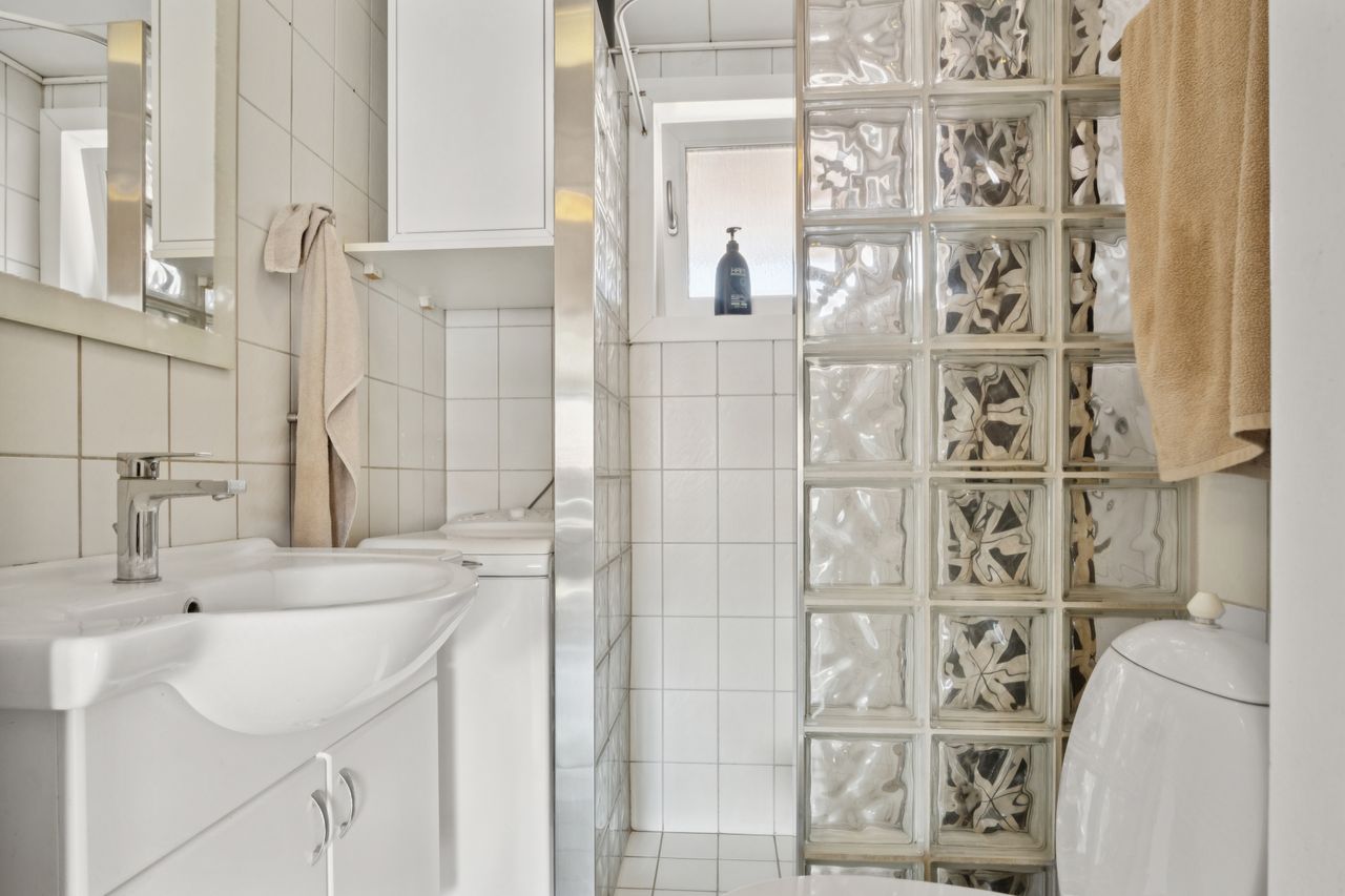 Flot lyst badeværelse, med hvide klinker på gulv samt vægge, sep. bruseniche, med glas mossaik flise vægge, gulvvarme mv.