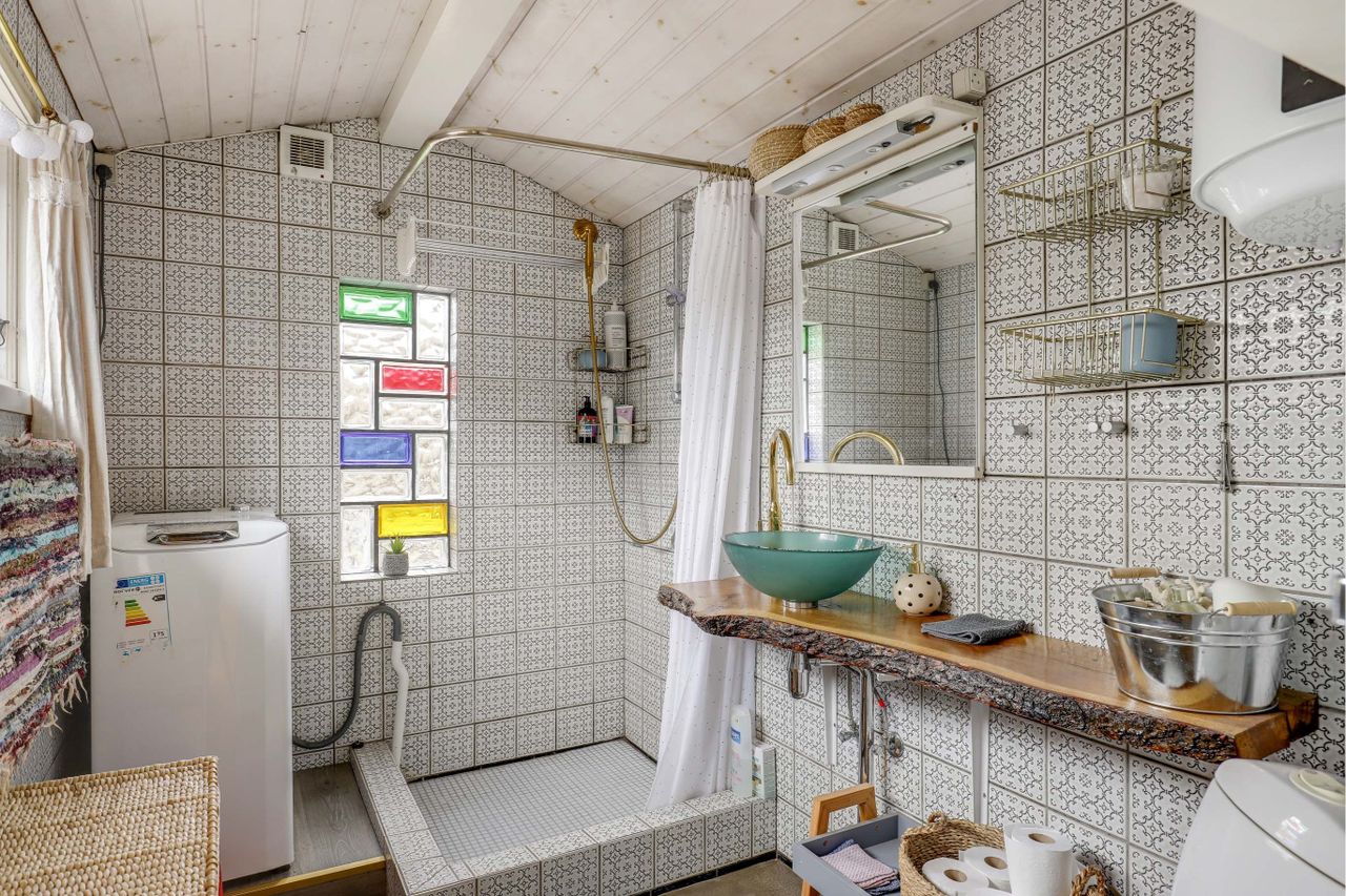 vaskemaskine, stor sep. bruseniche og en flot natur planke, opsat som bordplade, med en forhøjet vask