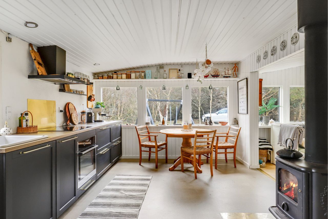 Skønt lyst køkken / alrum / stue i et, med brændeovn i midten, af huset, epoxy gulv i køkken / alrum , med