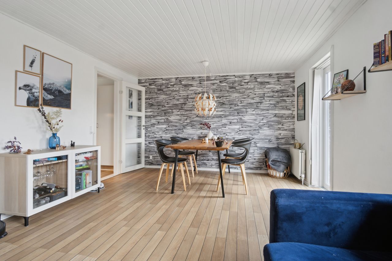 Dejlig stor lys møblerings venlig opholdsstue, med god plads til stort spisebord og indretning af hyggelig opholdsstue, der er udgang til haven og fra stuen er der udsigt til haven fra stort panorama vindue, der er isat elegant " trend " glasdør til køkkenet og der er pålagt et " skibs planke " laminatgulv.