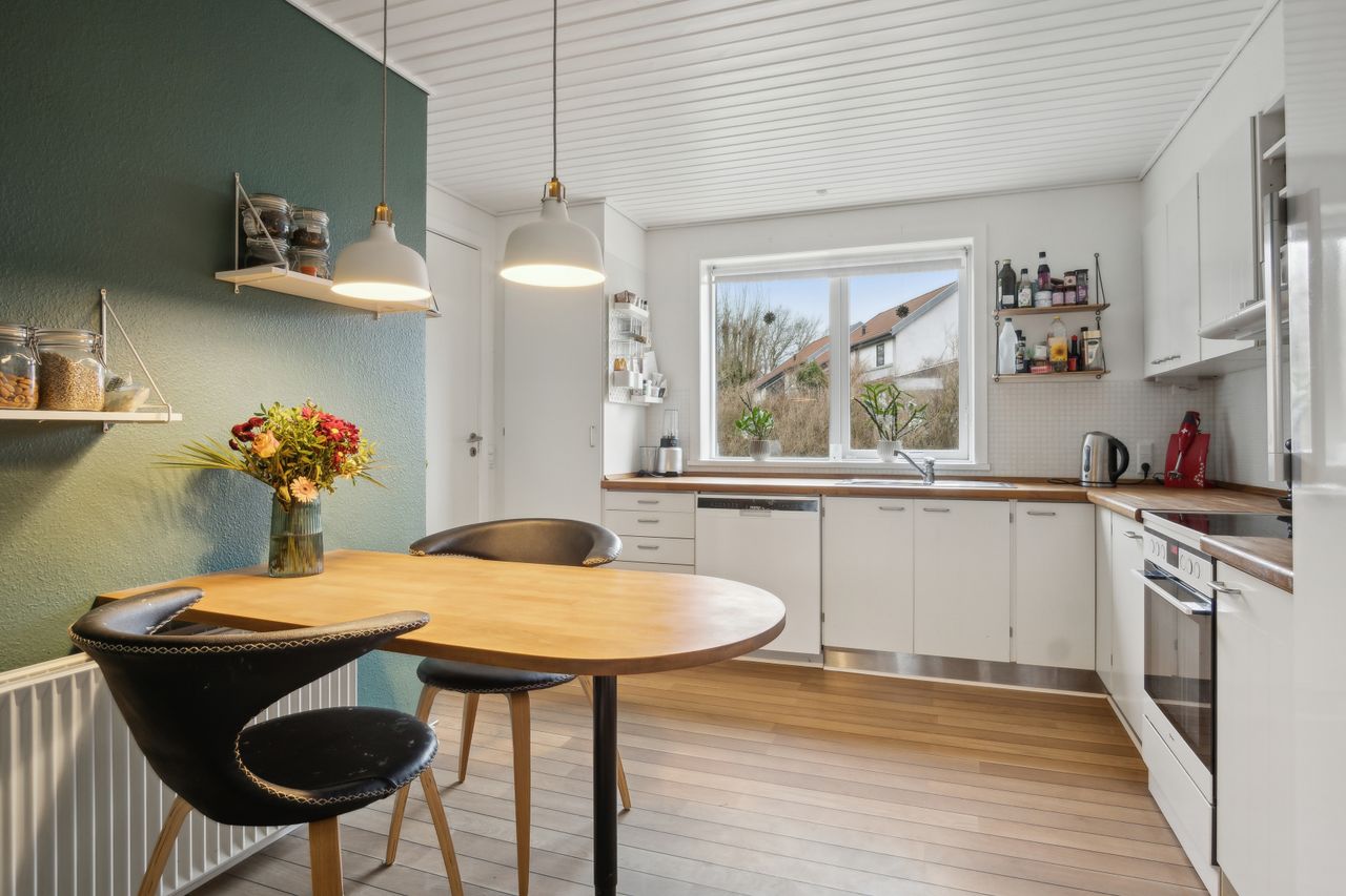 Dejligt lyst køkken, med et hvidt elementkøkken, nydeligt pålagt " Skibs planke " laminatgulv, massiv bordplade, et malet rustik loft samt plads til spiseplads.