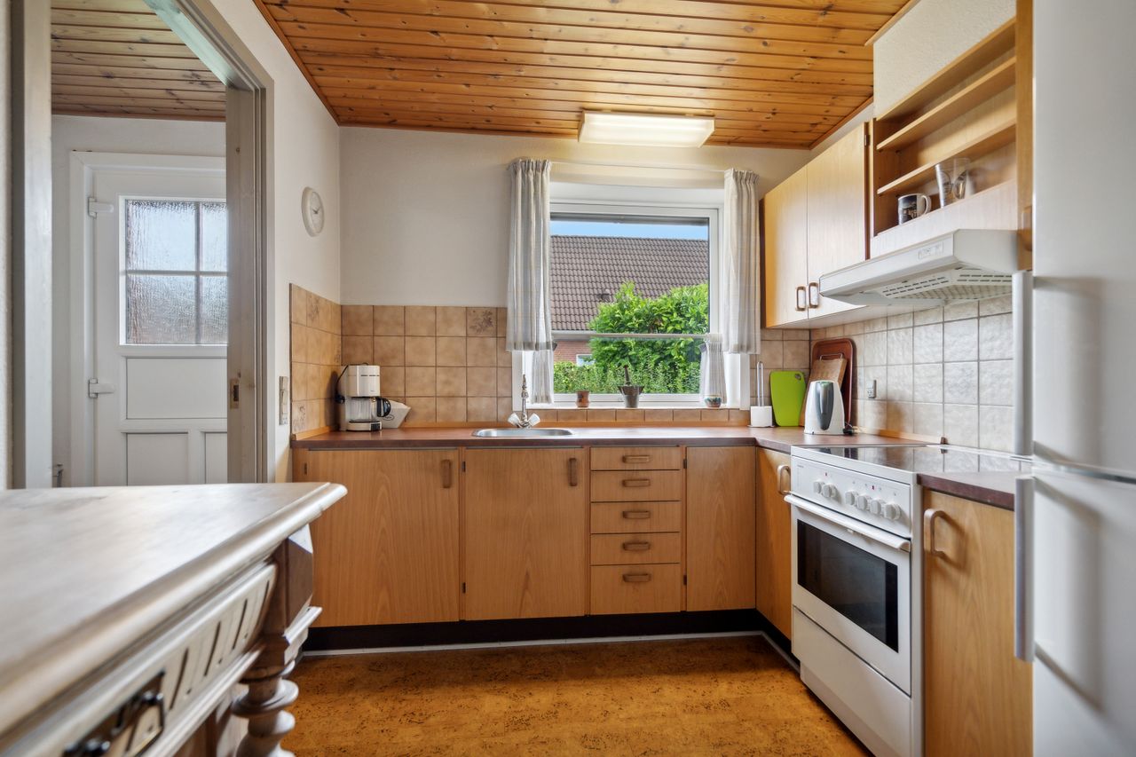 Hyggeligt køkken, med et ældre elementkøkken og vinylgulv pålagt.