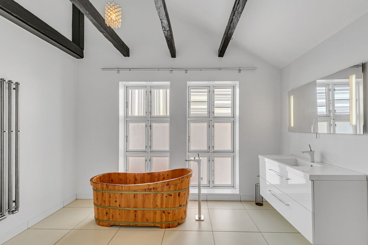 Særdeles stort flot lyst badeværelse, med store hvide gulvklinker , flot stor sep. bruseniche, ophængt design toilet samt smart håndklædetørrer, flot badeværelses miljø skab, med nedfældet håndvask, gulvvarme, smart træ badekar og loftet ført til kip, med synlige hånebånd.